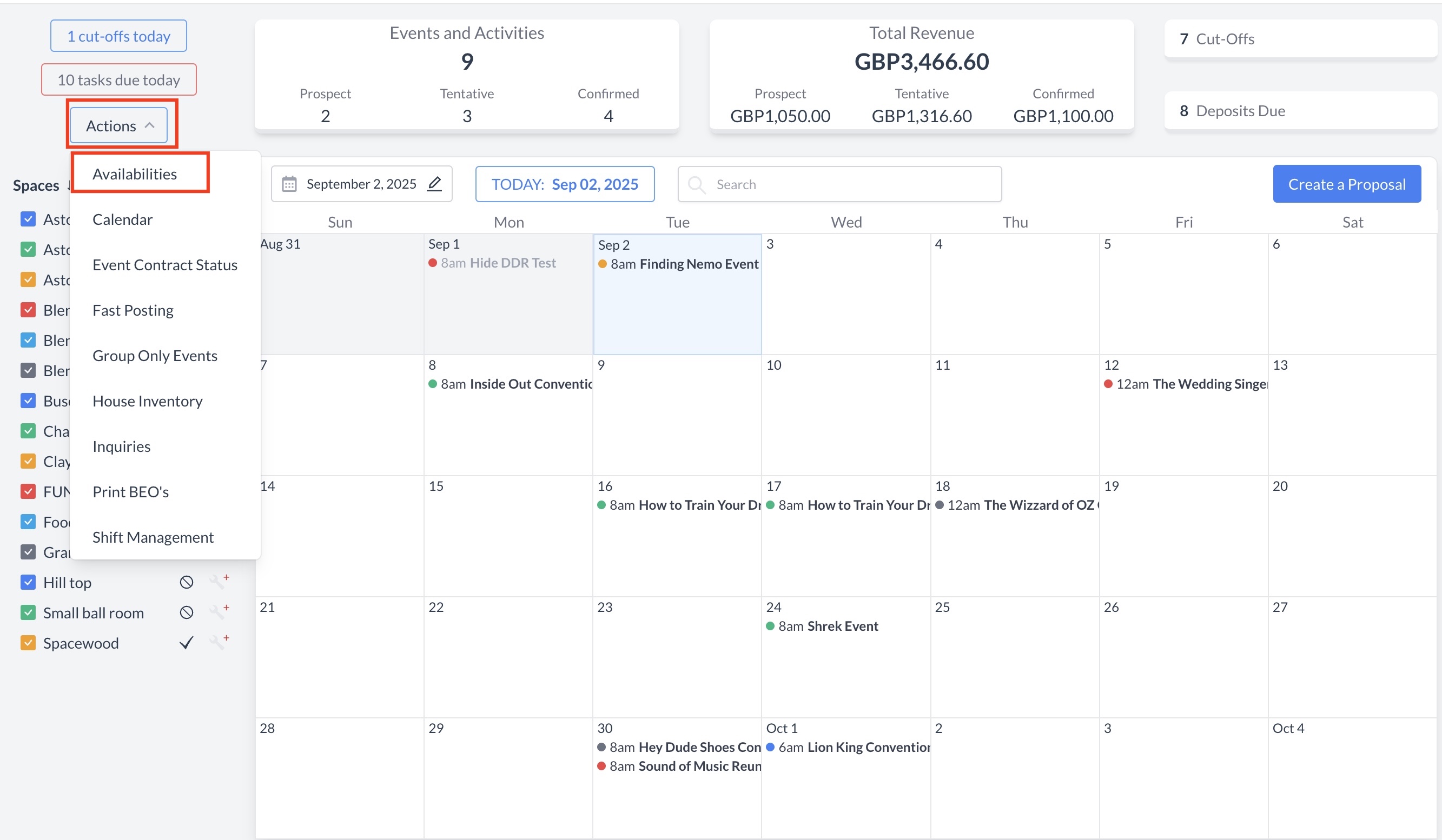 The Availabilities screen provides a dynamic, visual calendar that helps you efficiently manage event spaces and monitor the status of all eventsβConfirmed, Tentative, and Prospectβat a glance.