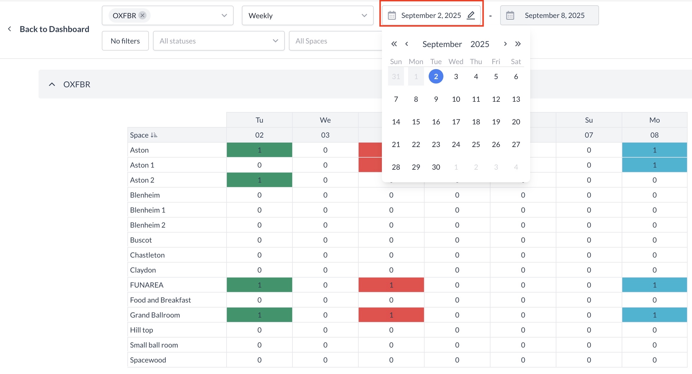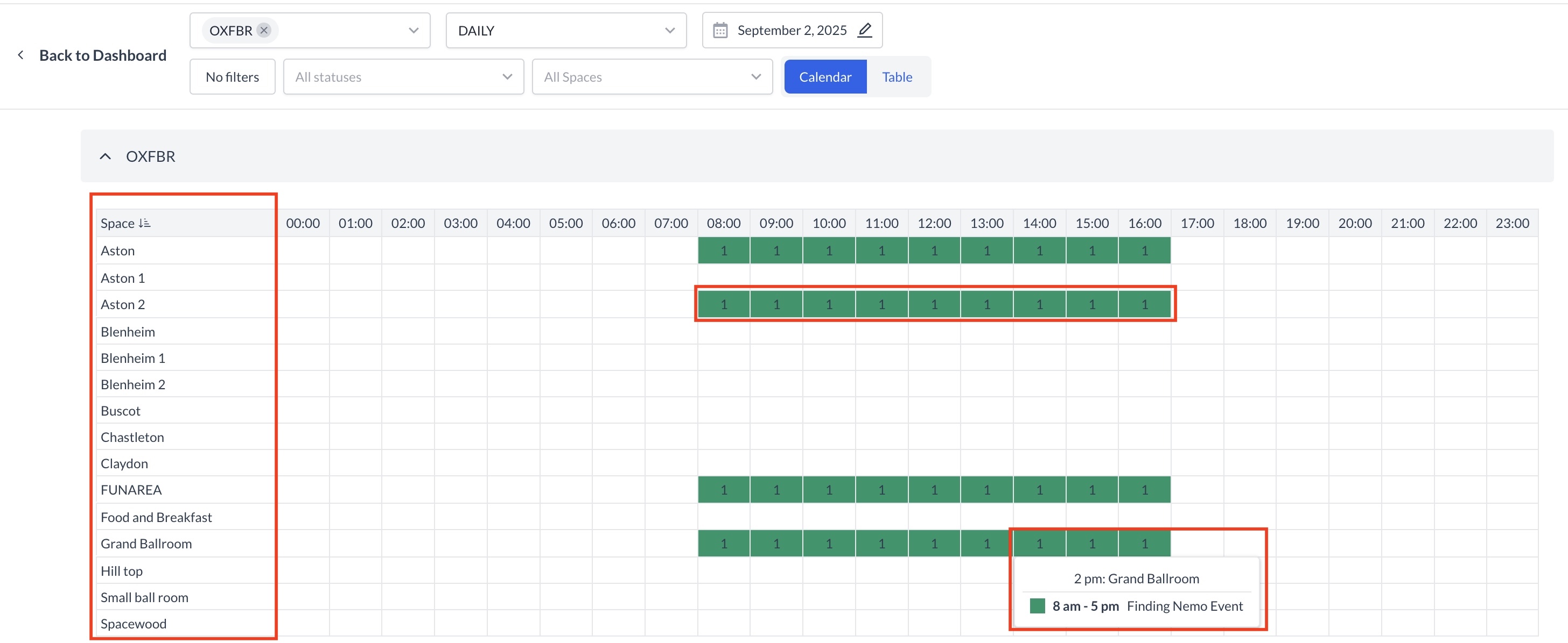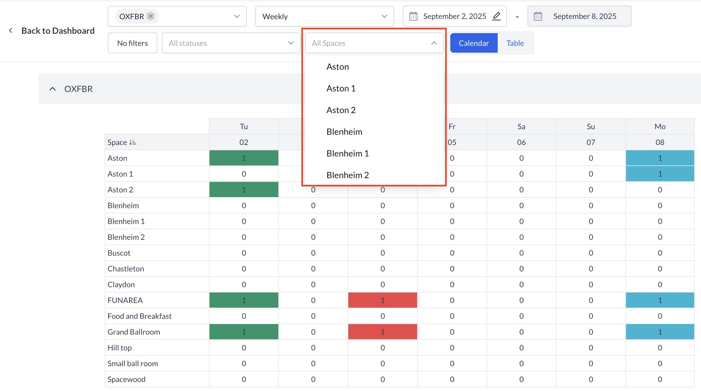 Filtering by Space By default, the calendar displays all spaces. To view events for a specific space, click the All Spaces dropdown and select the desired space. The calendar will then update to show only the events scheduled in that space for the selected time period.