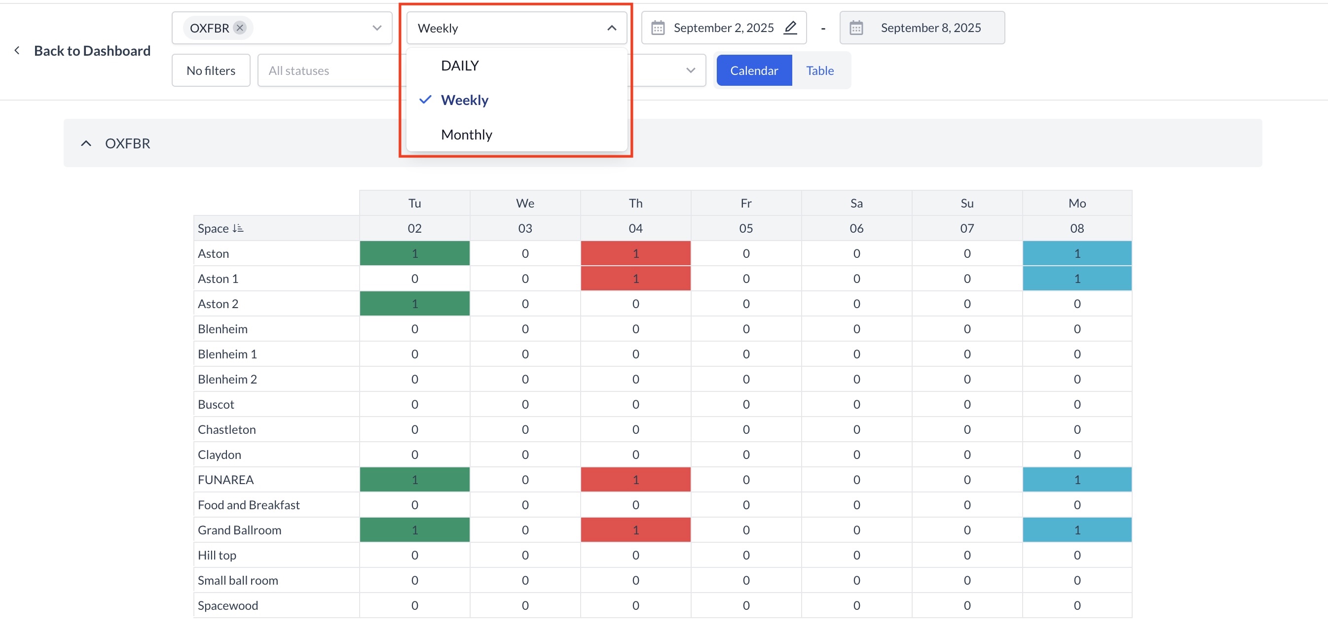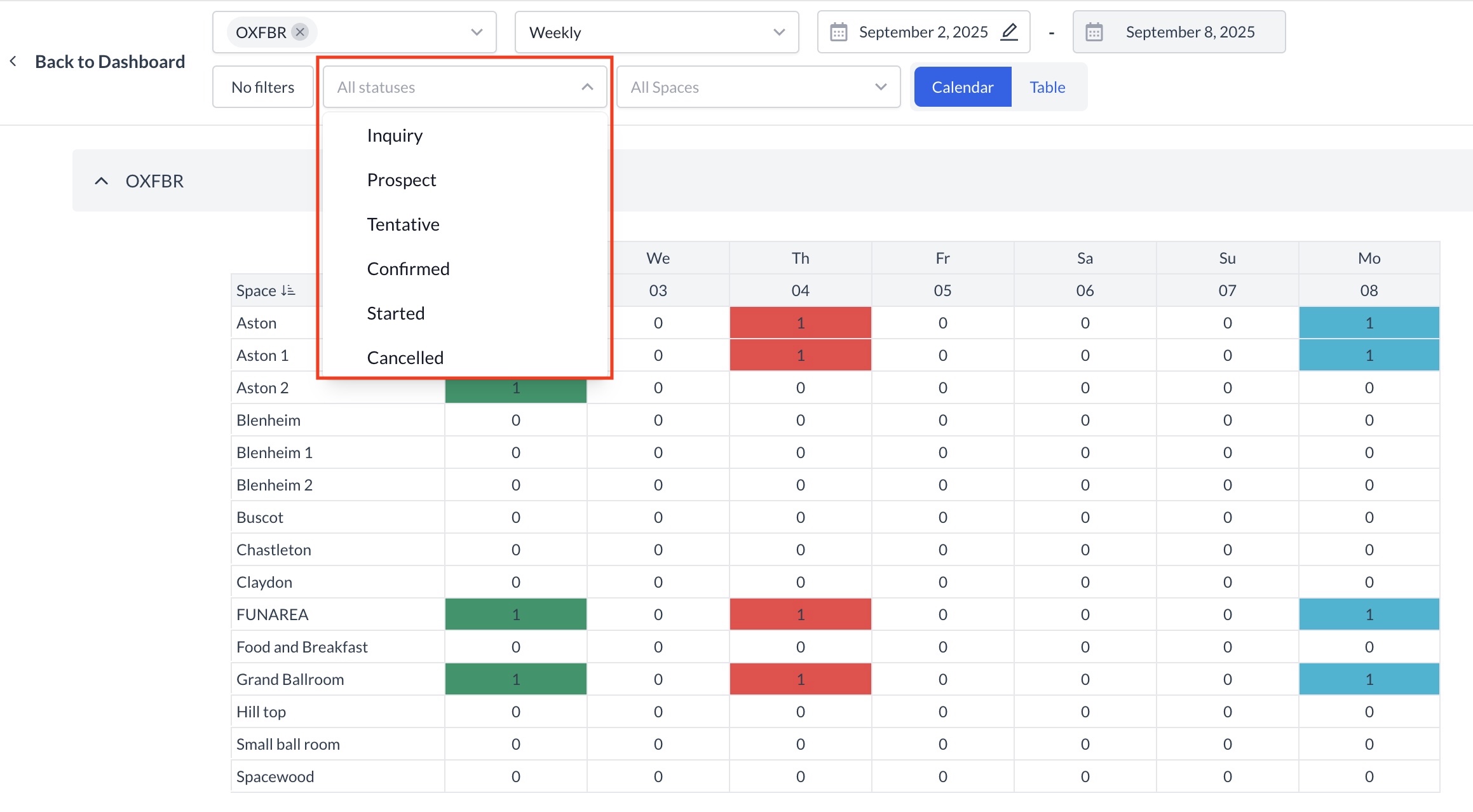 If a space has an event with a Prospect, Tentative, or Confirmed status, the corresponding time block on the calendar will be shaded and display a number.