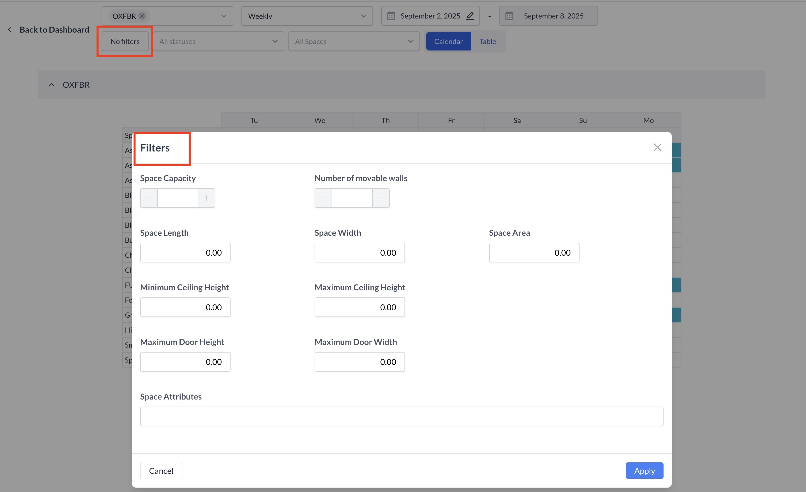 Using Filters to Refine the Space List Click the Filters button to narrow down the list of spaces based on specific criteria such as capacity, space width, total area, and custom attributes. Click Apply to see the filtered results.