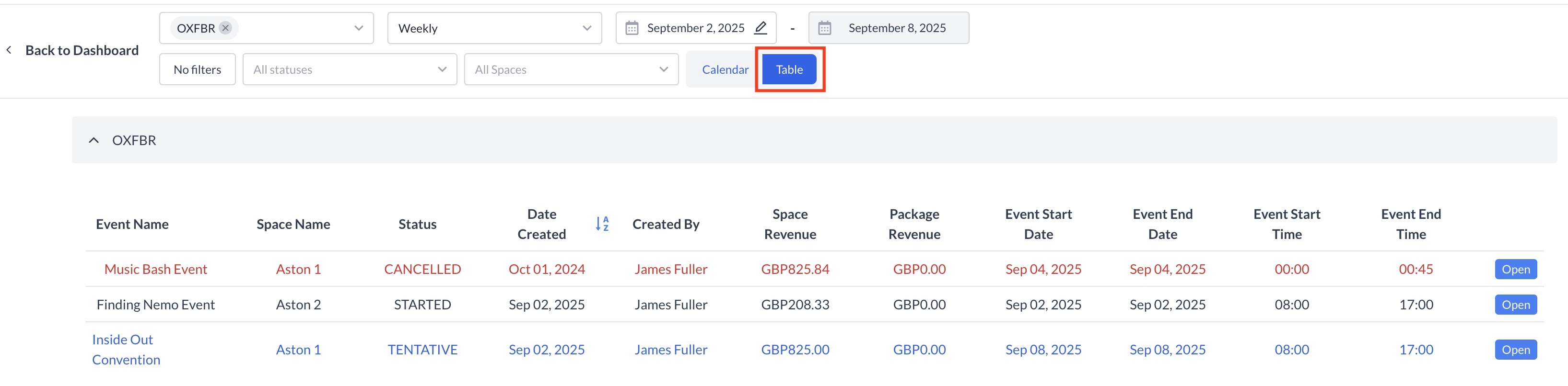 Switching to Table View Click the Table button to switch from the calendar view to a consolidated table view. This format presents the event data in a report-style layout, making it easier to review and analyze details in a structured format.