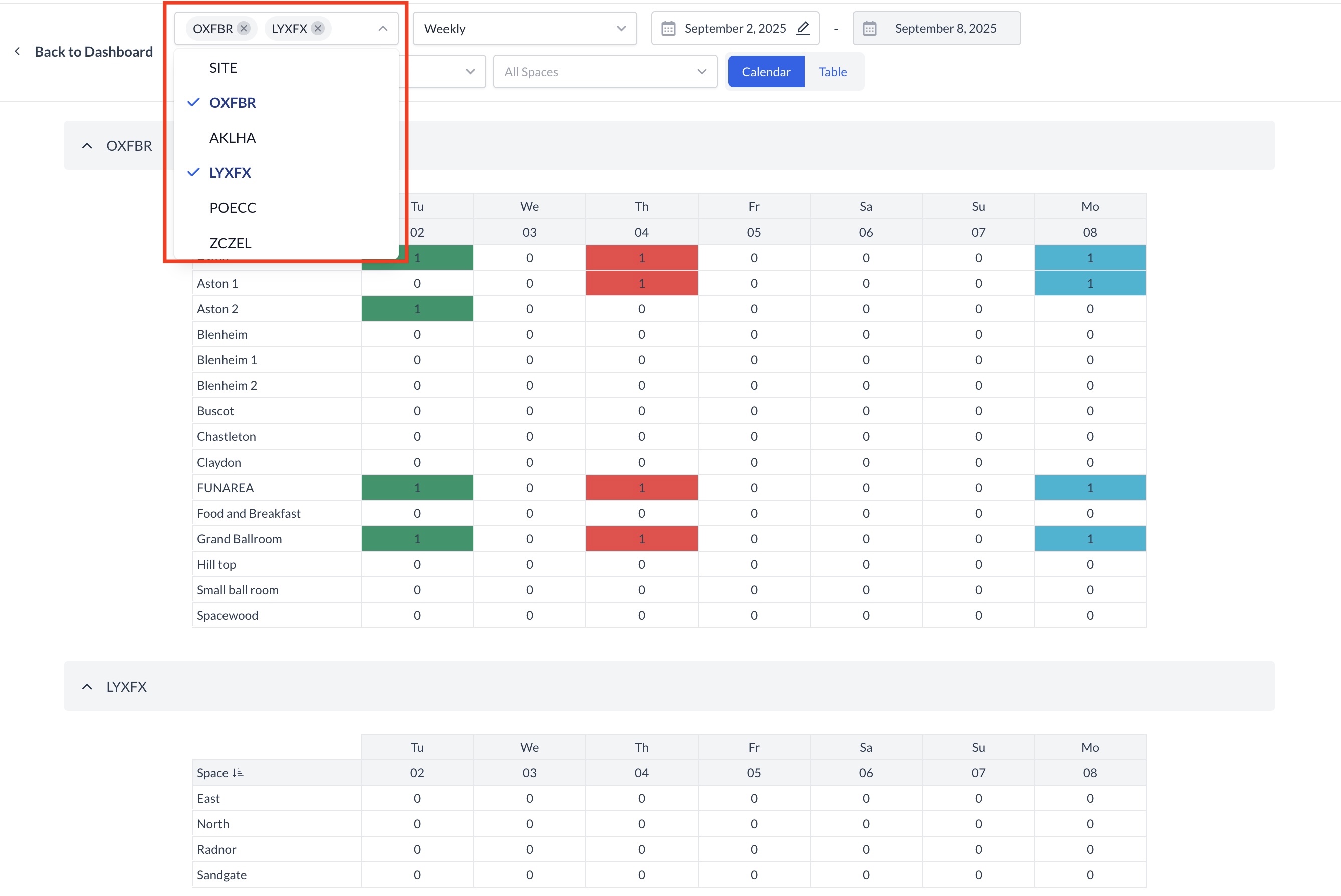 Viewing Multiple Properties Users with access to multiple properties can use the Property dropdown to select one or more additional properties. This enables you to view space availability across all selected properties in a single, unified view.