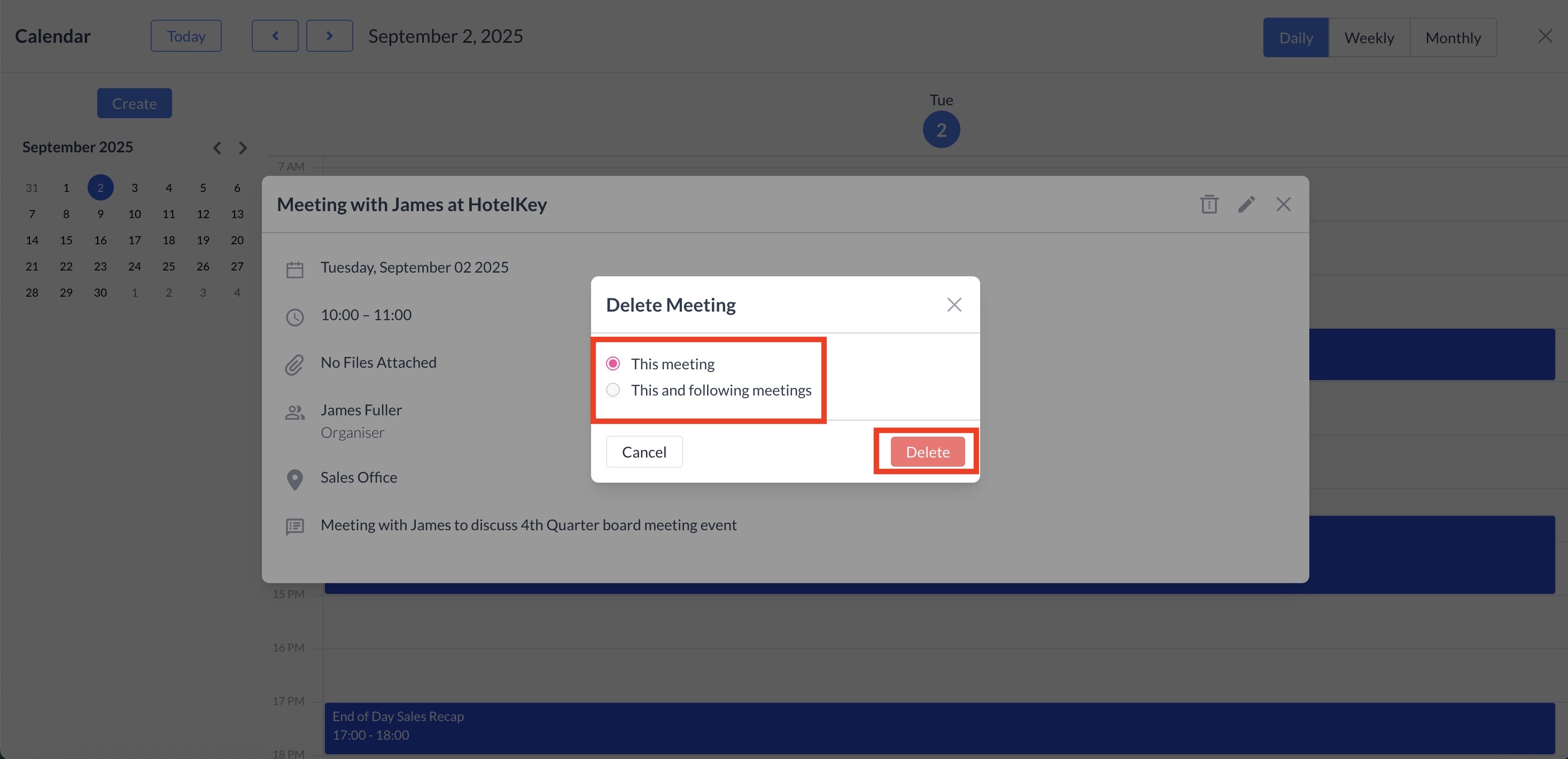 Select the appropriate option, then click the red "Delete" button to confirm. Your appointment will be successfully deleted.