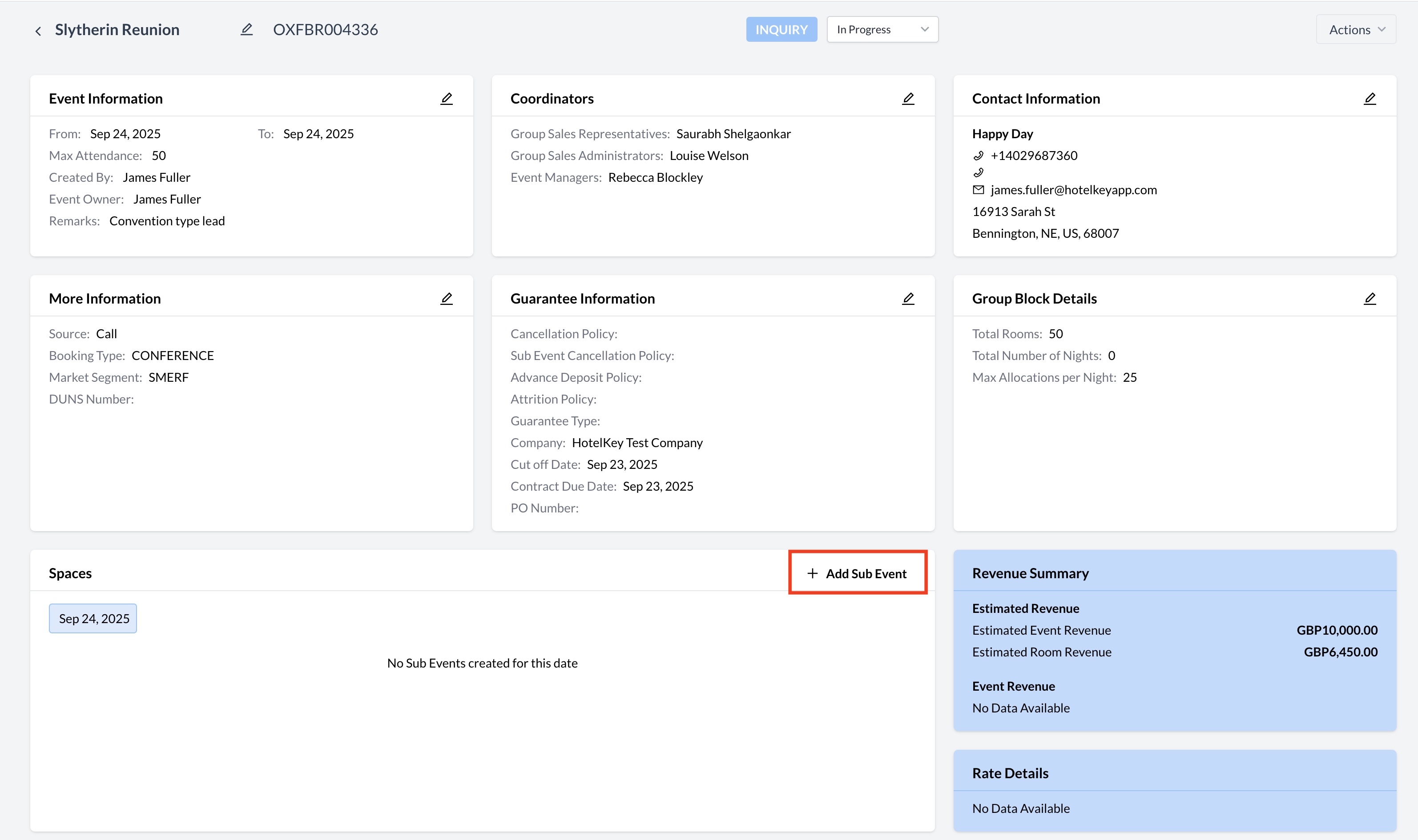 Before converting an inquiry into a prospect event, you must first create a sub-event. The sub-event defines the potential meeting space, rental rate, and estimated number of attendees. To create it, click the Add Sub Event button under the Spaces section.