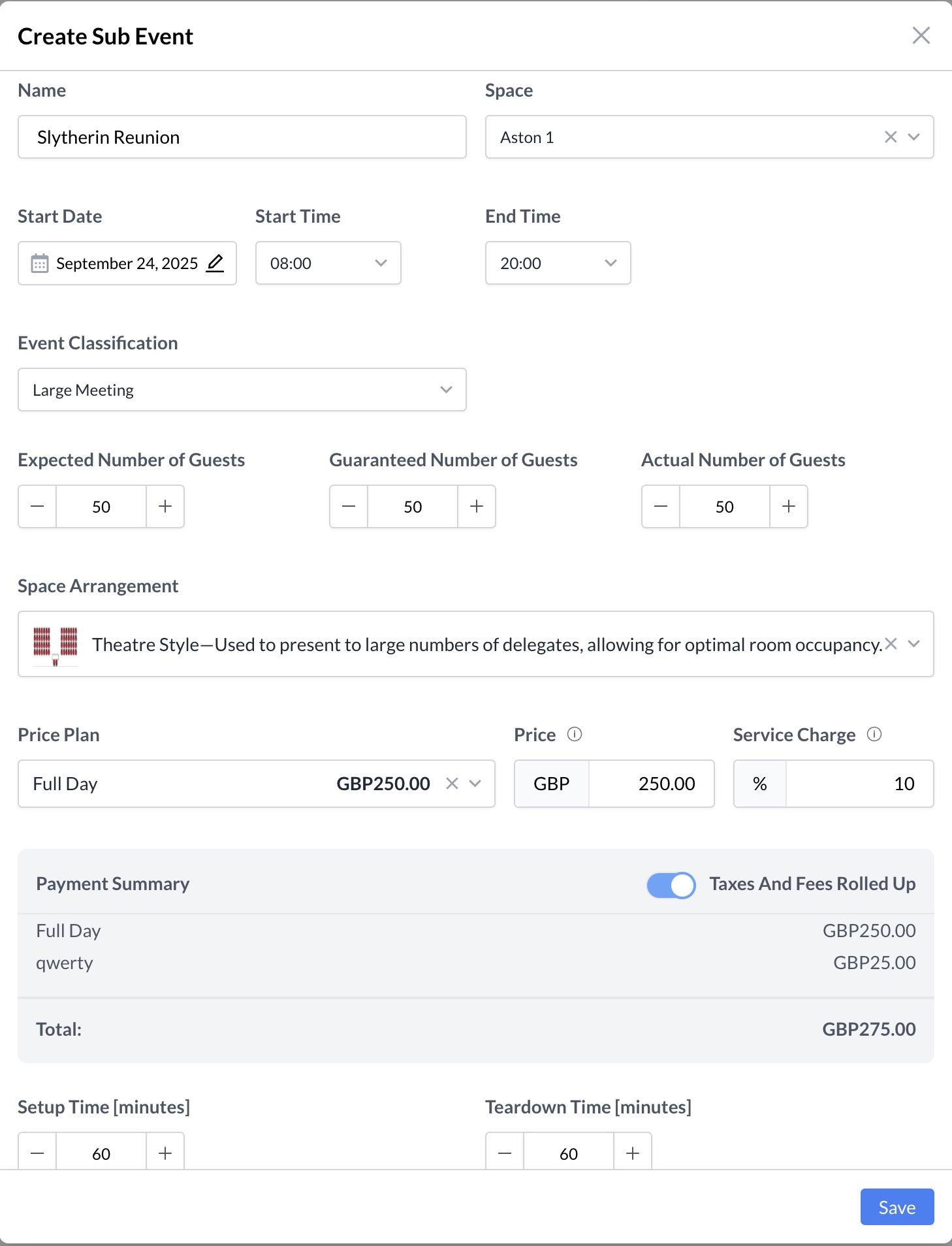 Once all details are entered, click the Save button to create the sub-event.