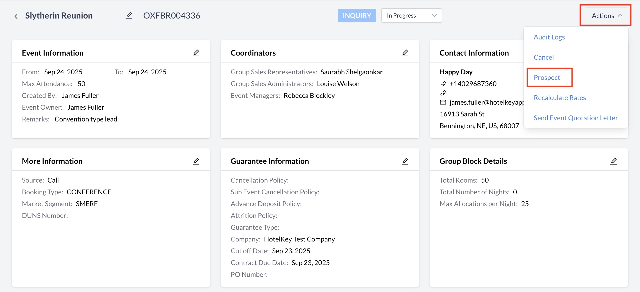 Action Menu: Converting an Inquiry to a Prospect Event