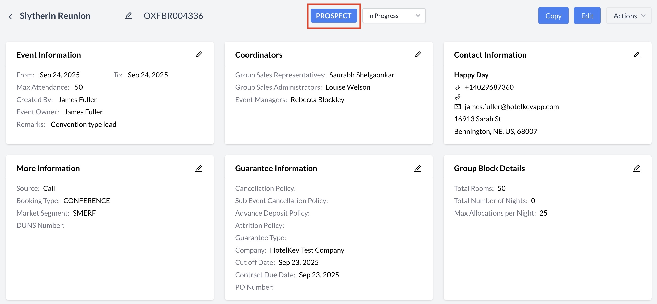 The event is now in Prospect status. You can confirm this by checking the top center of the screen, where the inquiry status now displays as Prospect.