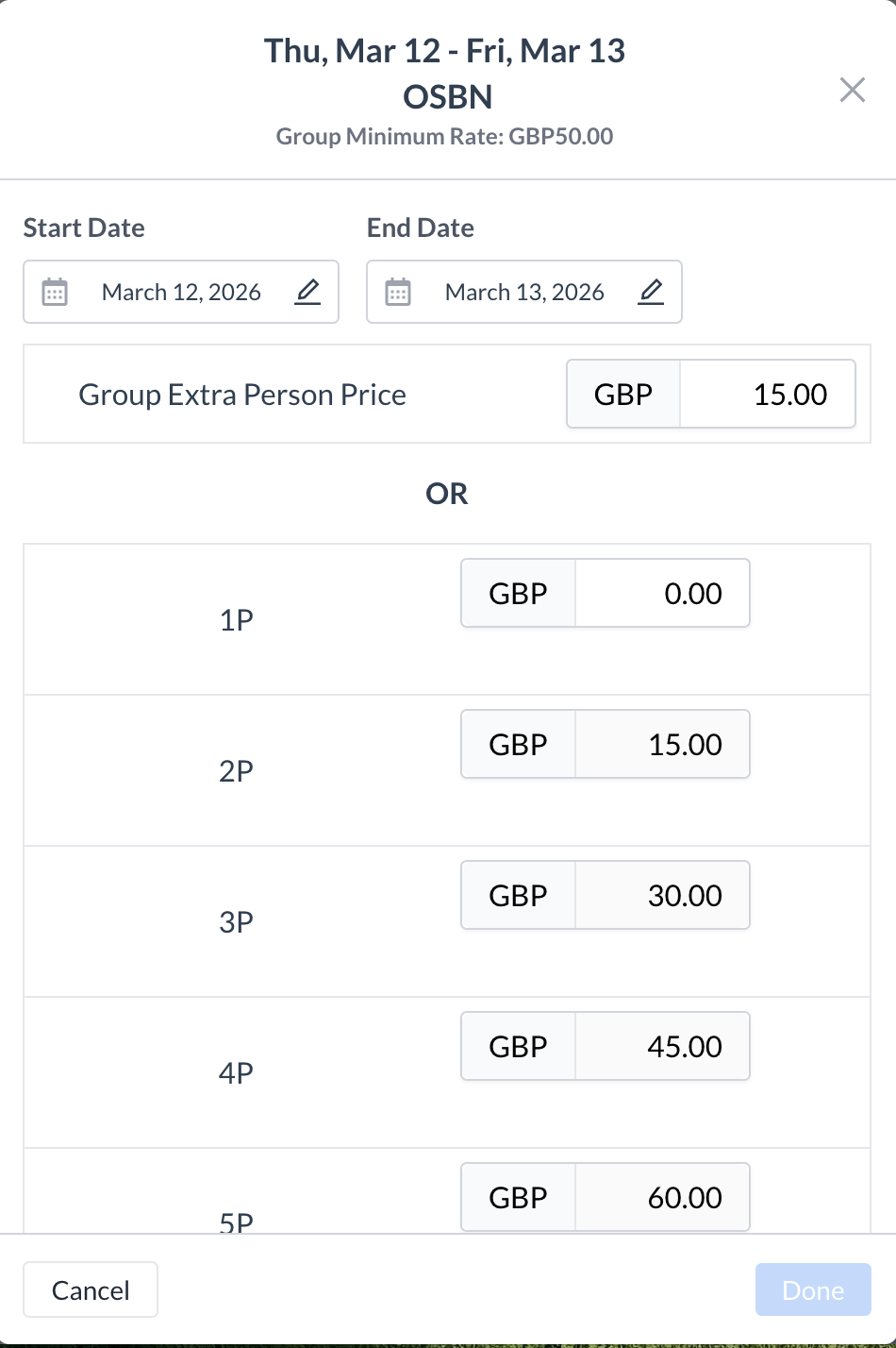 ✅ Final StepAfter reviewing and making any necessary changes, click the blue “Done” button to save the pricing changes. | ![]() Group Block Section - Edit Price Button ![]() Edit Pricing ![]() Edit Pricing - Individual Day & Specific Room Type ![]() Edit Pricing - All Dates for a Room Type ![]() Edit Pricing - All Room Types for a Single Day