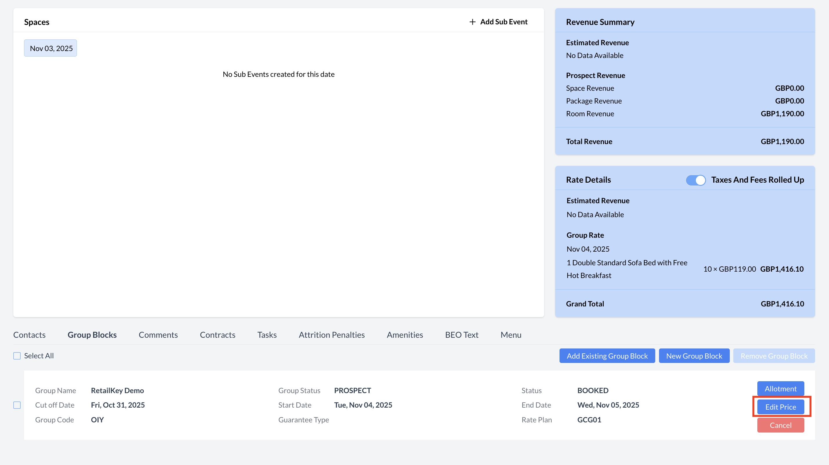 Once a group is created, the Property Management System (PMS) becomes the system of record (or "master") for the group. This means that most group edits must be made directly in the PMS. However, you can still manage Inventory and Pricing for the group within EventKey. 📌 To manage group blocks in EventKey: