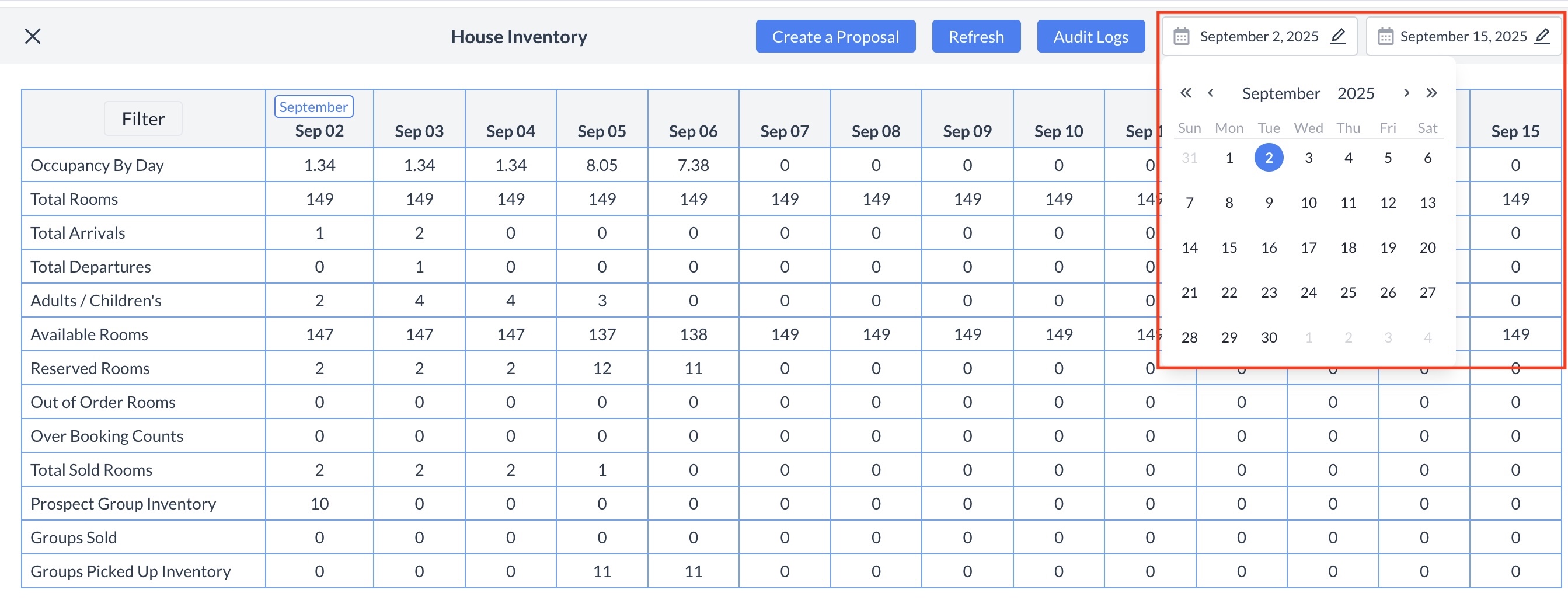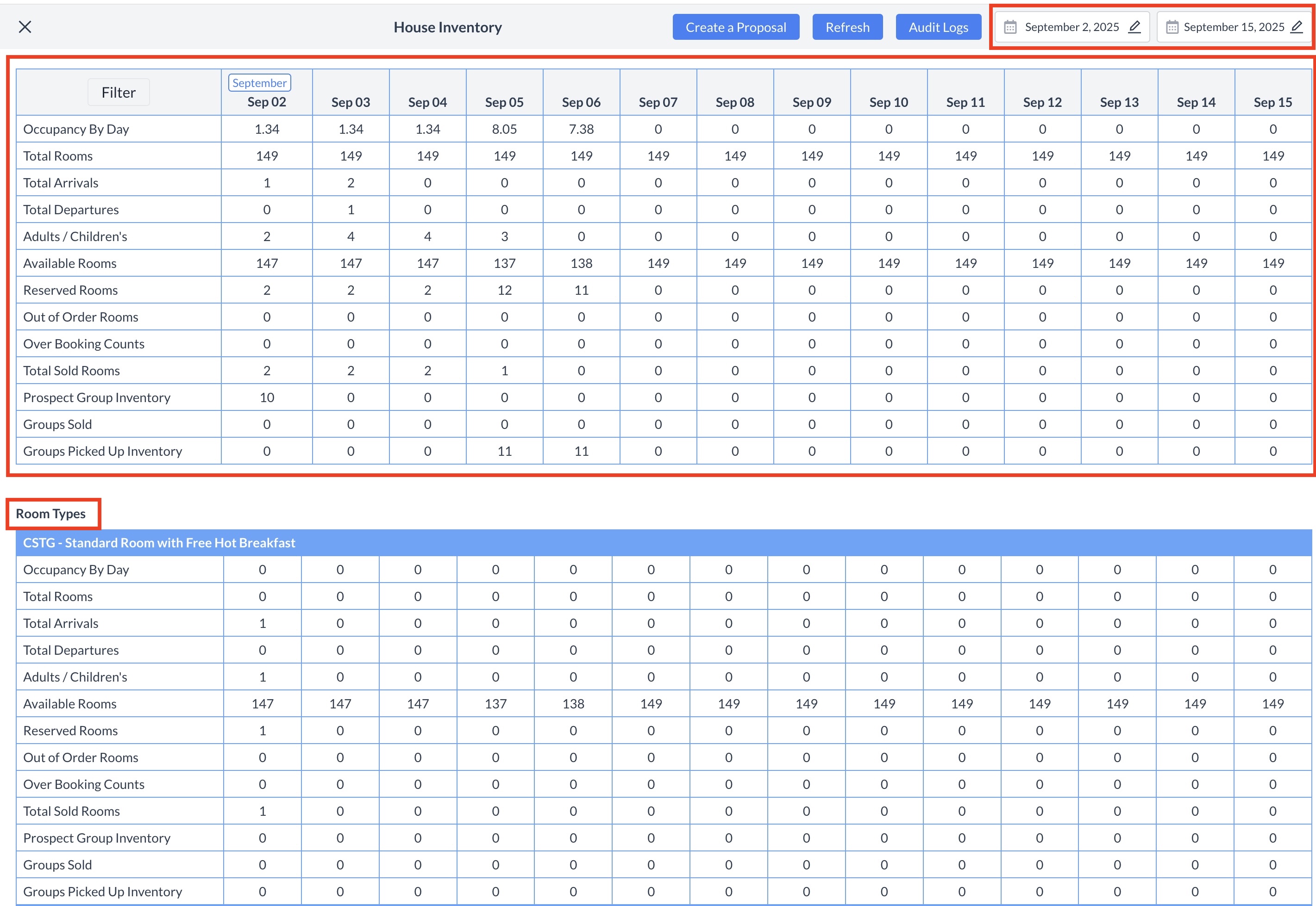 House Inventory Screen OverviewThe House Inventory screen provides a comprehensive snapshot of your property's sleeping room status. By default, it displays data for the current business day and includes a 14-day rolling view. You can view key room and occupancy metrics at the house level, broken down by day. The following information is available: