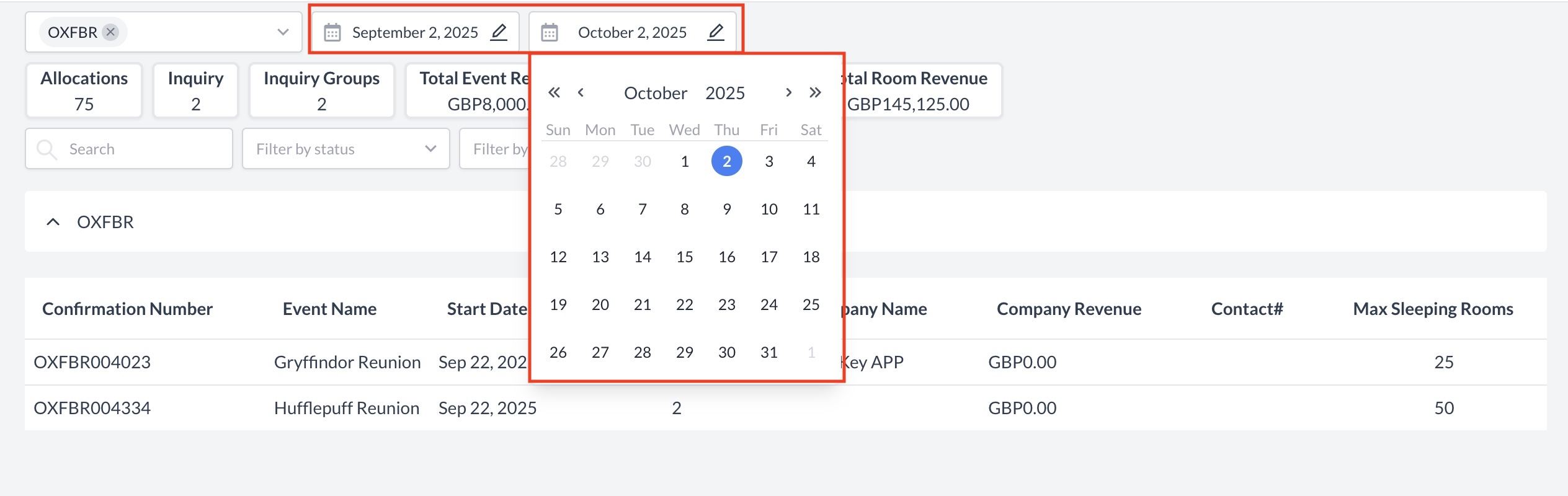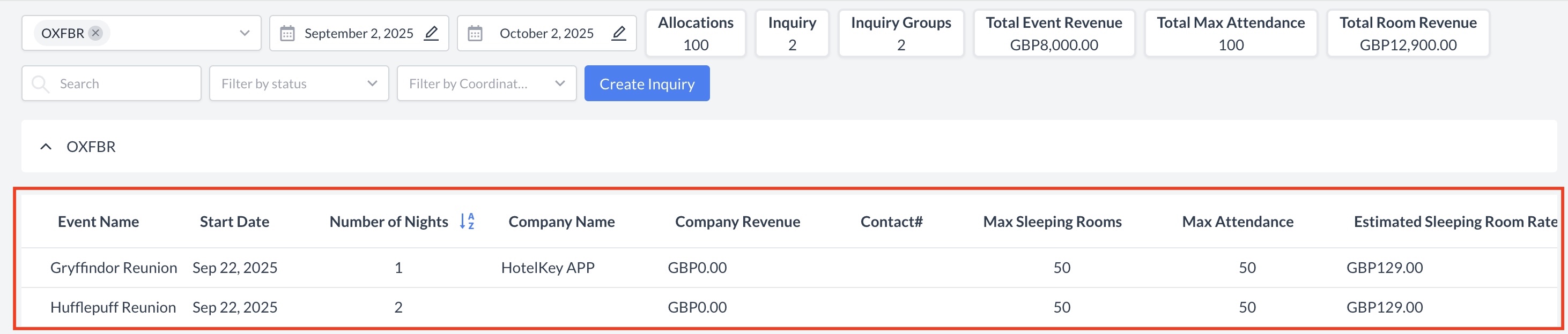 Allocations: Total number of sleeping rooms requested across all inquiries during the selected period.