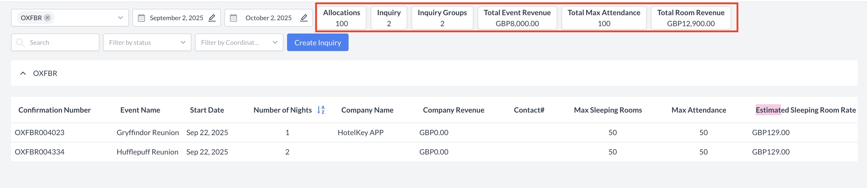 Total Max Attendance: Sum of the maximum expected attendees across all inquiries.