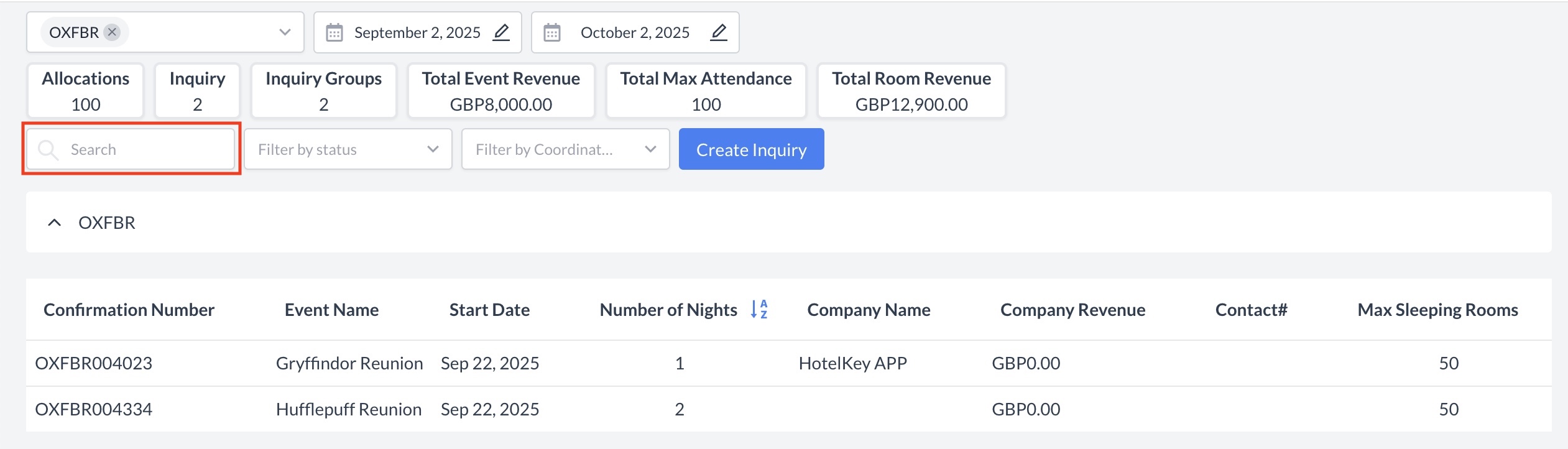 To quickly locate a specific inquiry, enter the Event Name into the search box. Matching results will appear as you type, allowing you to easily find and access the desired lead.