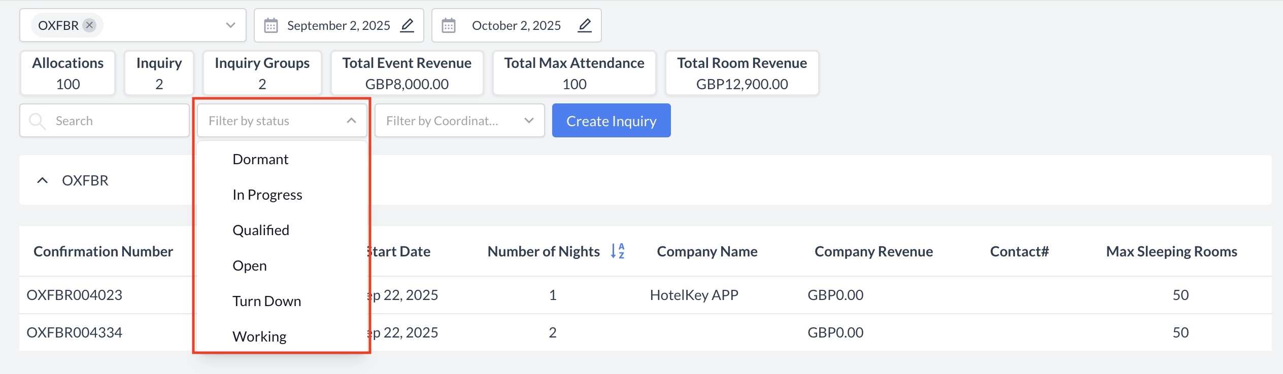 Use the Filter by Status dropdown to narrow your search based on the current inquiry status. Available options include:
