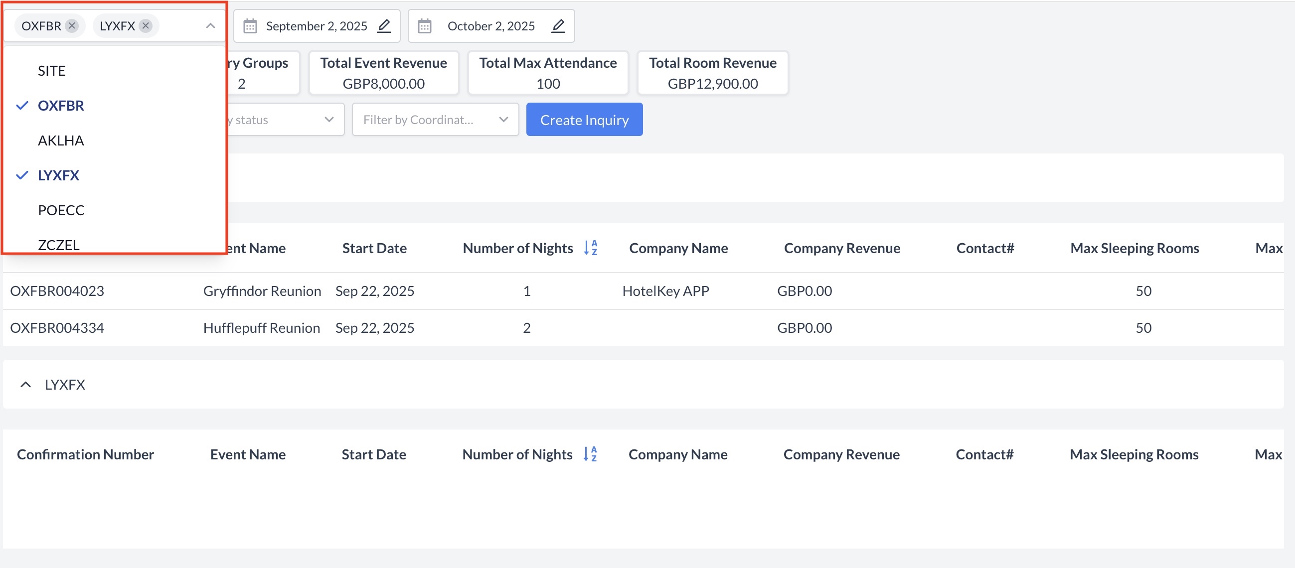 Viewing Multiple Properties Users with access to multiple properties can use the Property dropdown to select one or more additional properties. This enables you to view inquiries across all selected properties in a single, unified view.