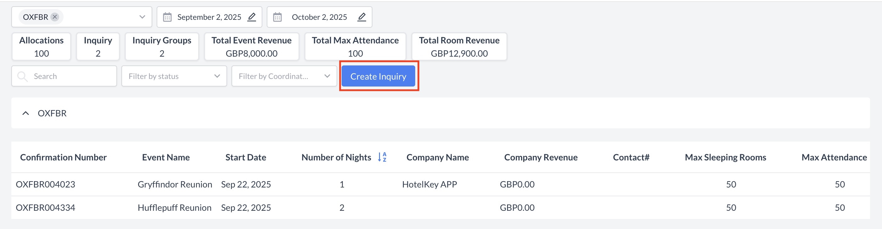 Note: Inquiries are currently manually created by the Sales team as a way to track leads, cold calls, client interest, and follow-ups. They serve as an important first step in the event sales process.
