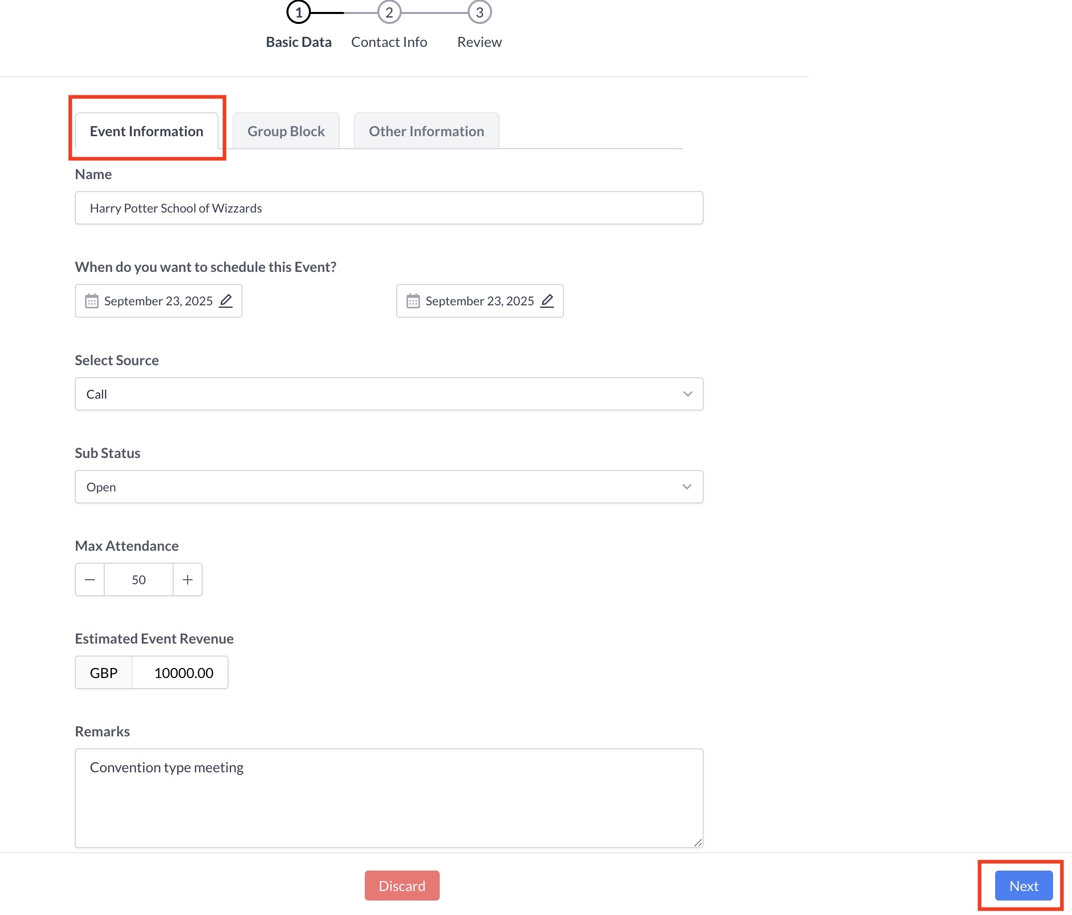 ⚠️ Note: If the event does not require sleeping rooms, you can skip this step and go directly to the Other Information tab.