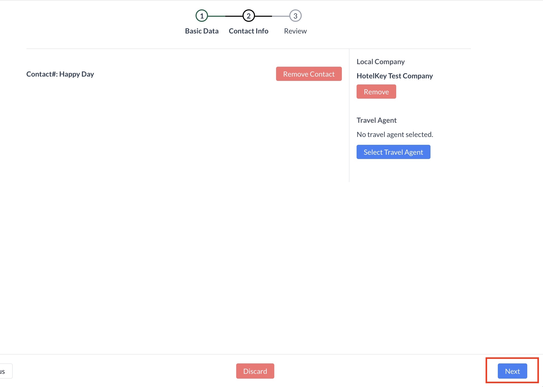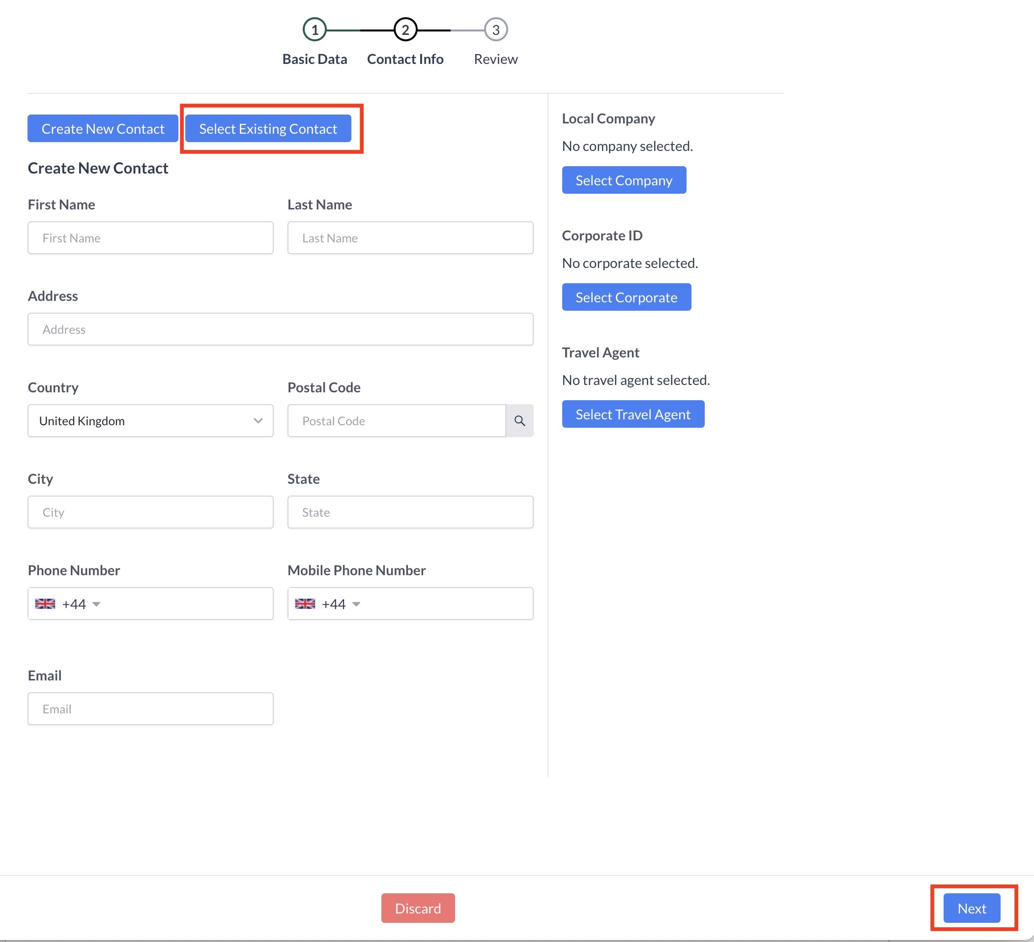 ➡️ If the booker is not associated with a company or travel agent, click the blue Next button to continue. If they are, proceed to the next step to add company or agency details.