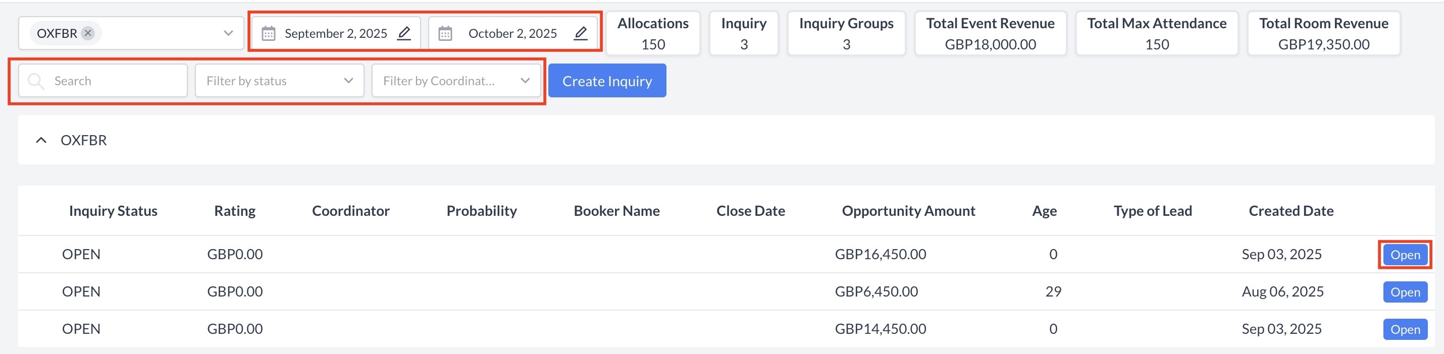 Filter by Coordinator: Use this option to filter inquiries by the assigned event coordinator.
