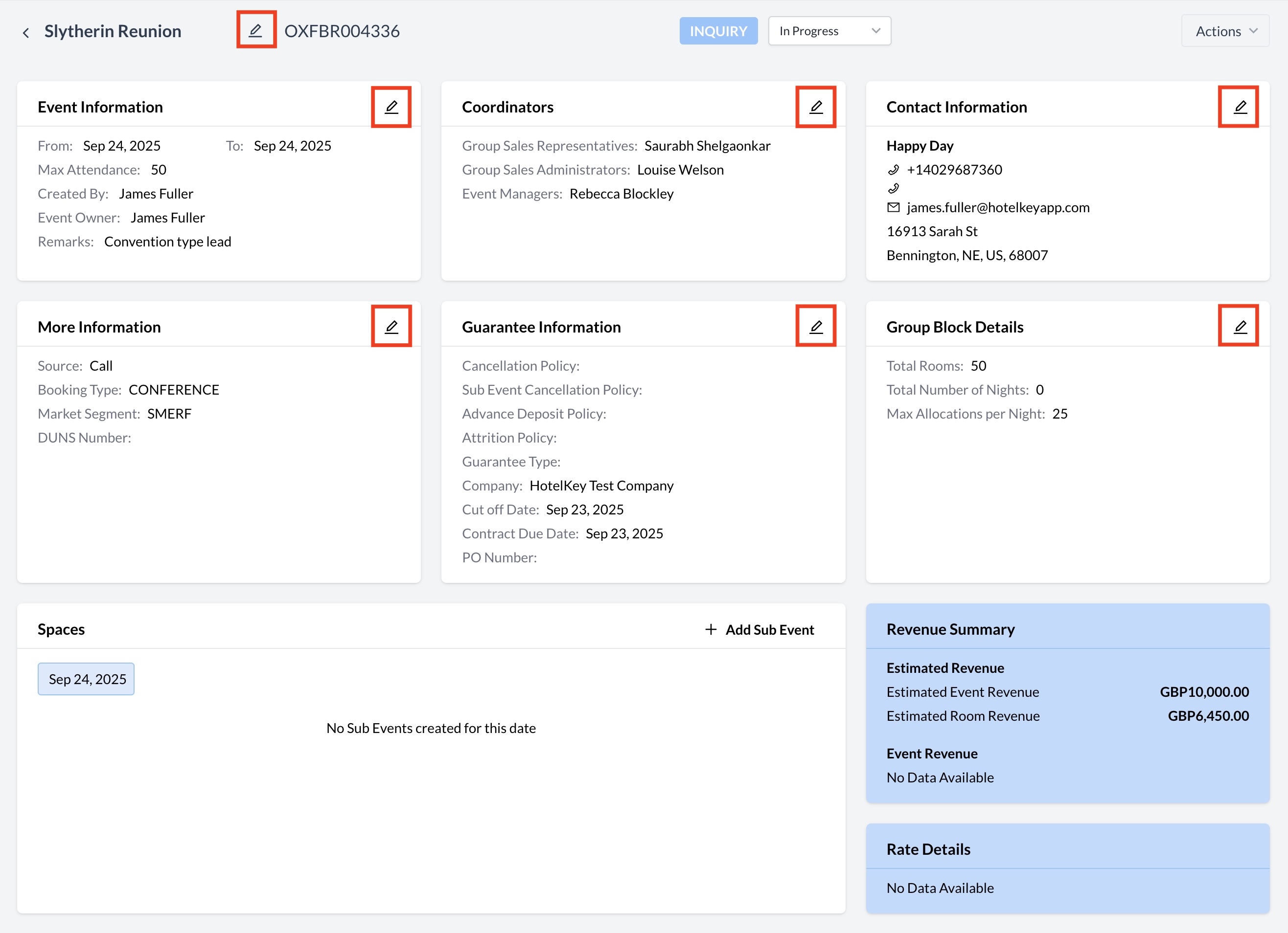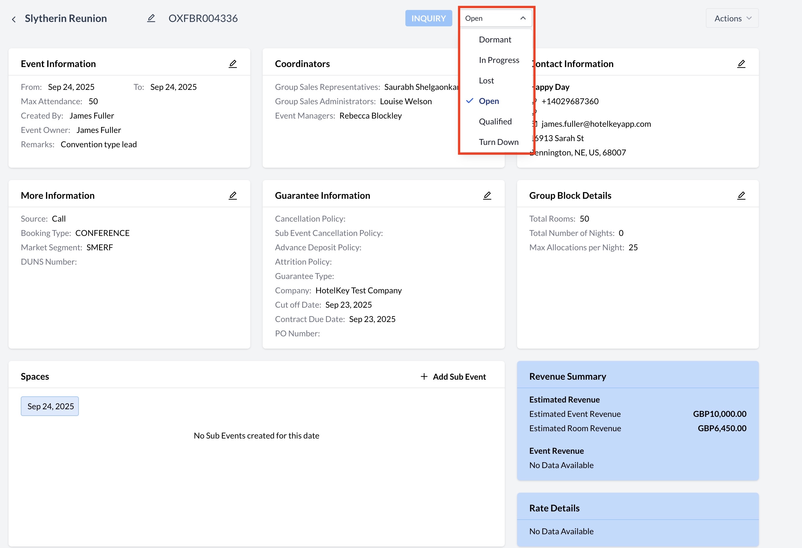 An Inquiry—also known as a lead—is an initial request from a potential client expressing interest in hosting an event at your venue. It typically includes basic event details such as dates, attendee numbers, and space or room needs.