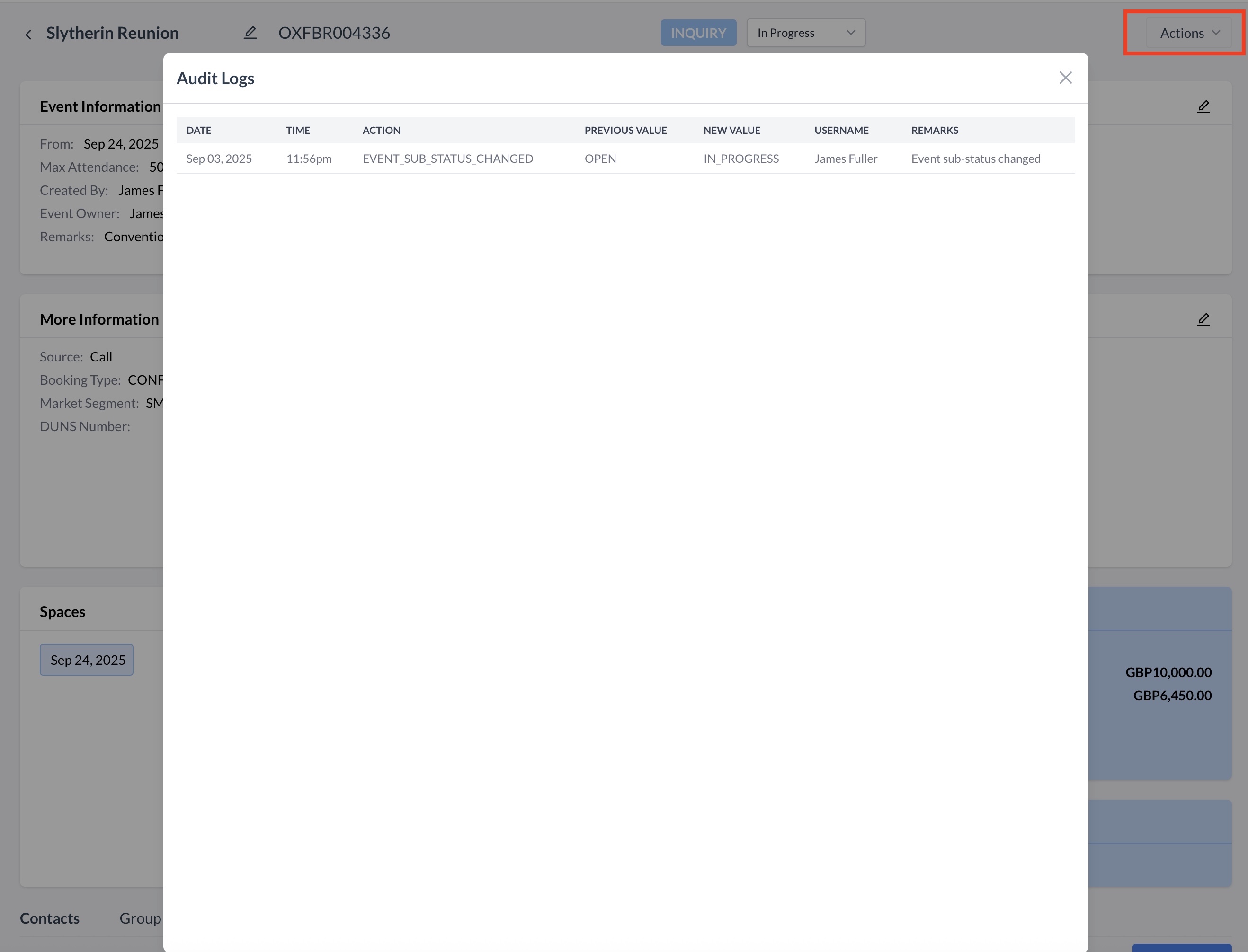Navigate to Home > Event Management > Actions > Inquiries