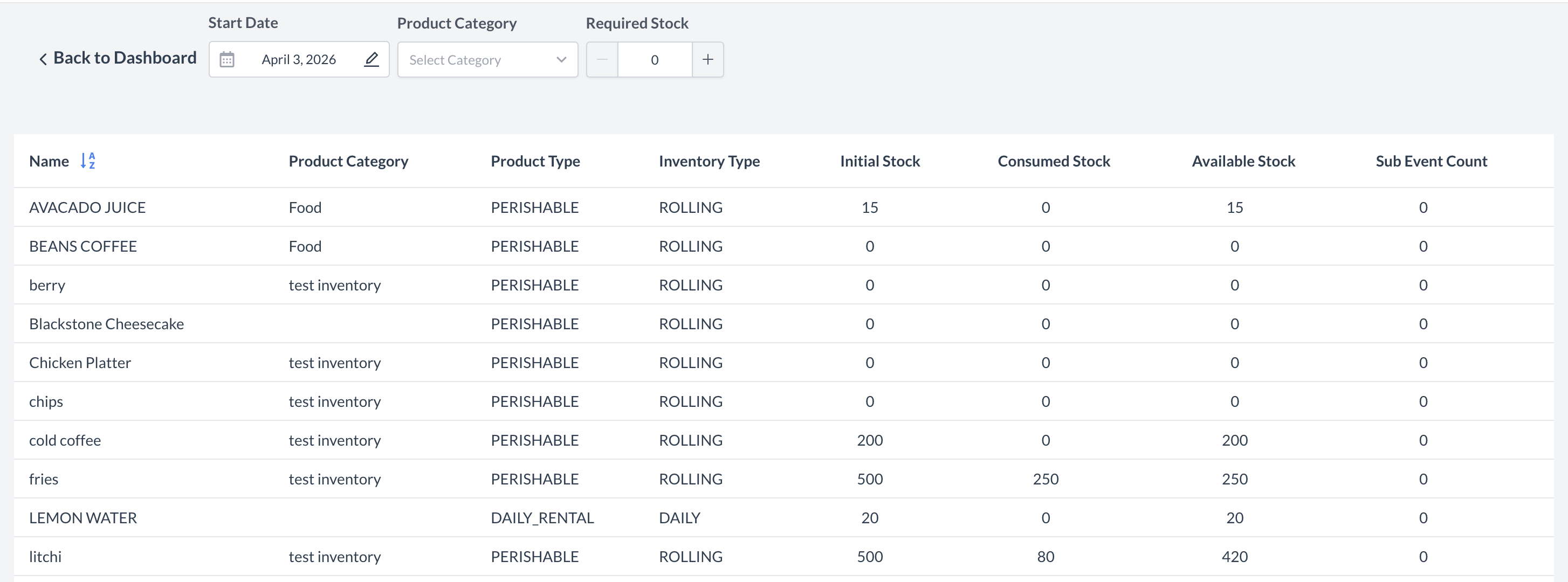 Product Inventory Screen OverviewThe Product Inventory screen provides a comprehensive snapshot of your property's product stock availability and consumption. By default, it displays data for the current business day. You can use the report filters to change the start date, view by product category or look for products by required stock. The following information is available: Name: Identifies the name or label assigned to the product. Product Category: A high-level grouping used to bucket similar items—such as Audio-Visual, Catering, or Decor—into organized sections within the system. Product Type: Indicates whether the product is classified as perishable or non-perishable. Inventory Type: Specifies if inventory tracking for the product is based on individual daily counts or a continuous (rolling) schedule. Initial Stock: Represents the starting inventory level of the product prior to any consumption or allocation. Consumed Stock: Displays the total quantity of inventory already used across all scheduled sub-events. Available Stock: The quantity of product currently in stock and available for use. Sub Event Count: Indicates how many sub-events have allocated or are using this product from inventory. | ![]() Product Inventory Screen |