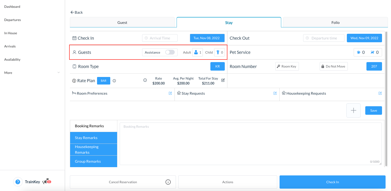 The booking details page loads with the Guest tab selected by default. Select the Stay tab. Select the Adult icon to add an adult to the booking. Select the Child icon to add a child to the booking. | ![]() |