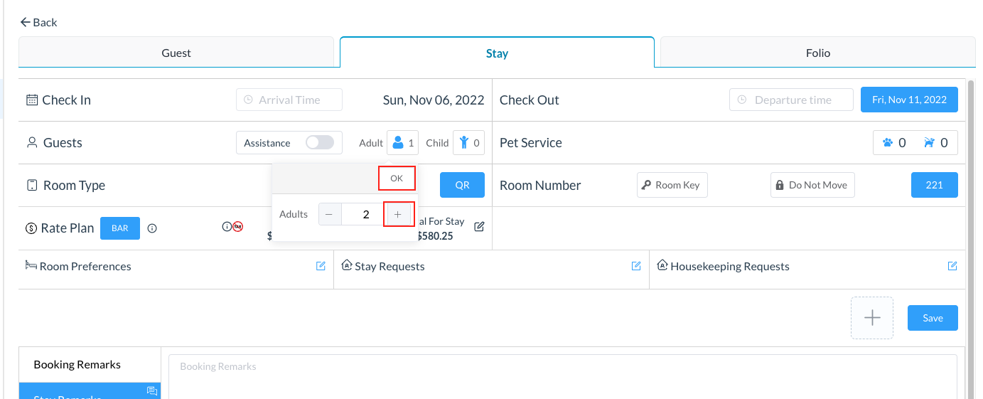 A popup opens for the applicable guest type (Adult or Child). Select the plus sign ( + ) icon to increase the number of the selected guest type. Select OK to save changes. IMPORTANT NOTE: It may be necessary to change the room type and rate plan. For example, if the number of adults is set to 2 and you need to increase it to 3 but the plus sign is disabled, indicating maximum adult capacity is reached for the booked room, a new room type and rate plan that can accommodate 3 adults must be selected. | ![]() |