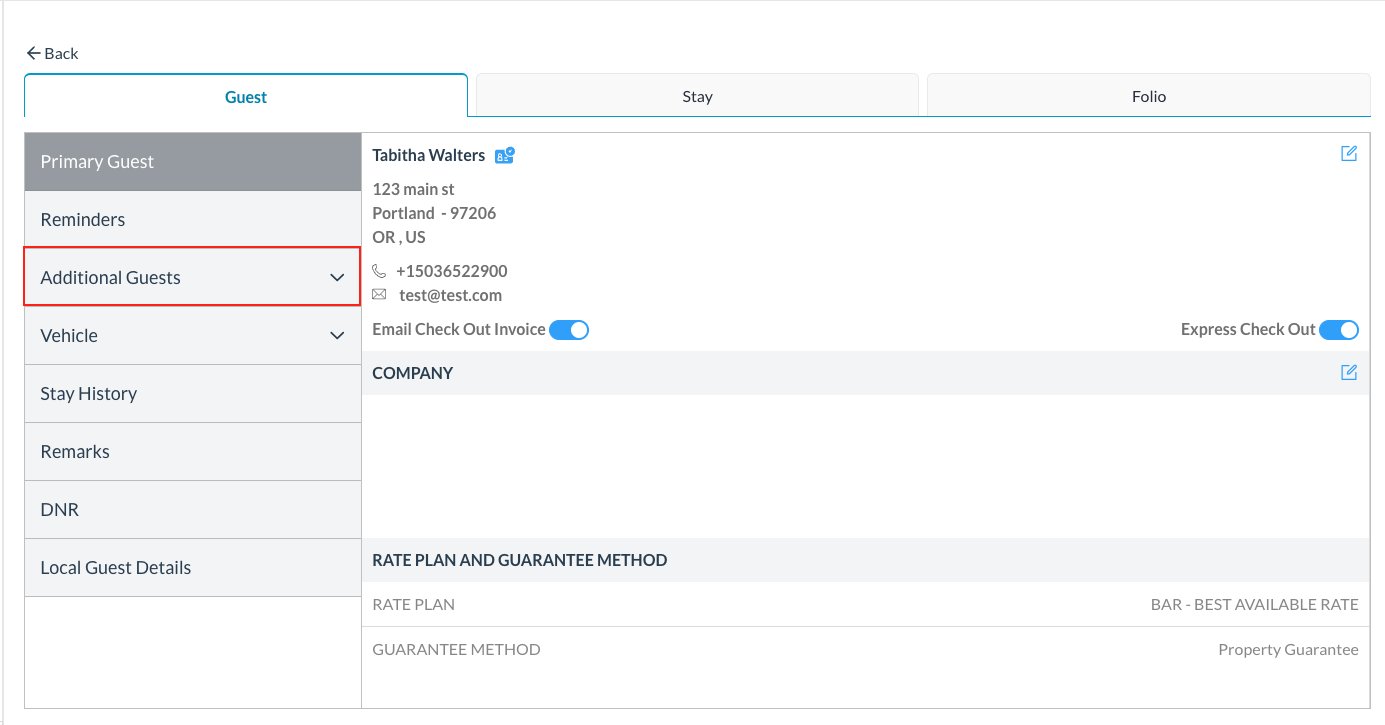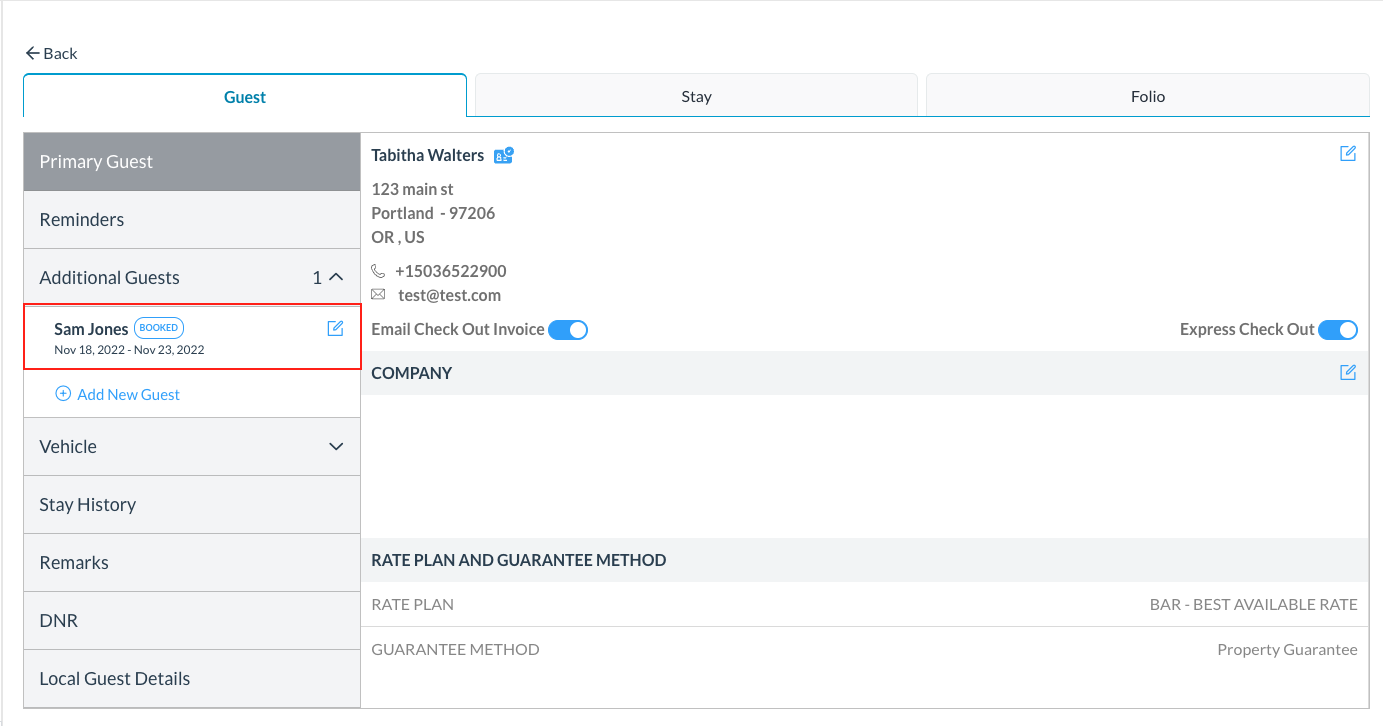 The Additional Guest Details popup closes and the new guest details are added on the Guest tab of the booking details page along with the guestโs reservation status. | ![]() |
