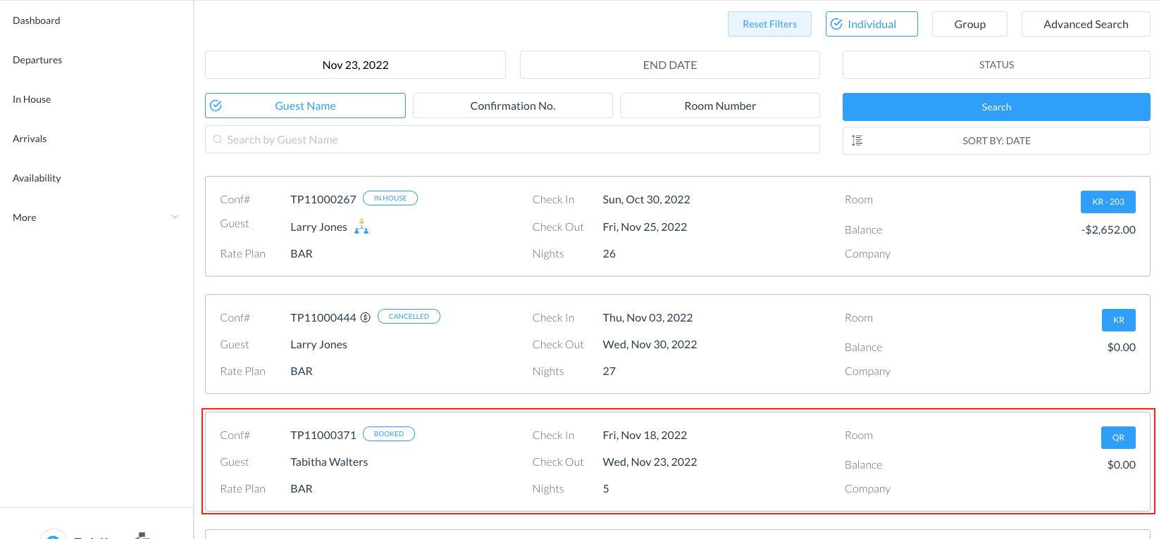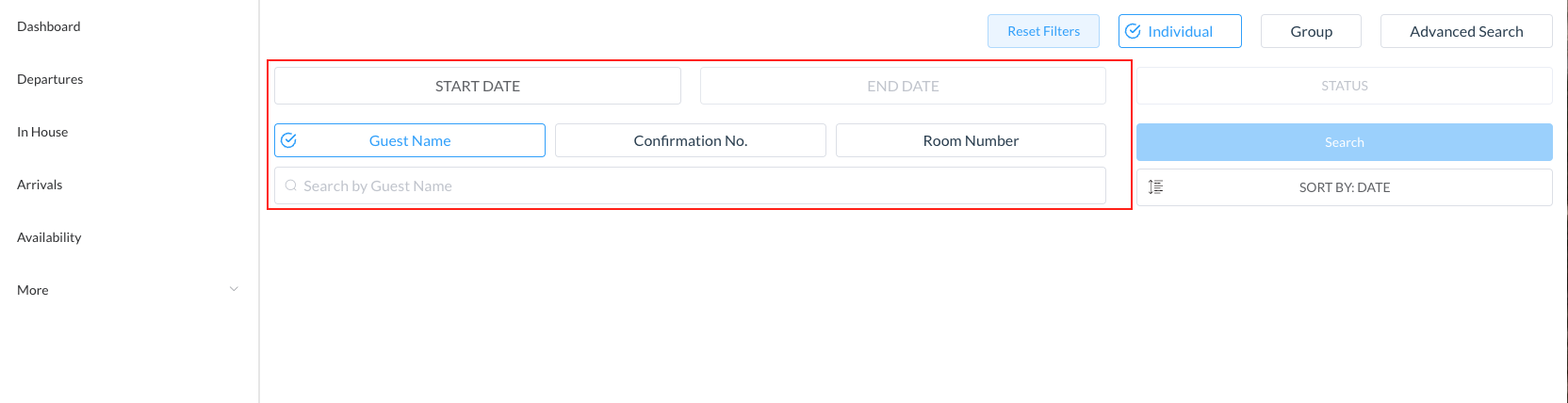 Search by options include: Start date, End date, Guest Name, Confirmation or Room Number for a in house guest Locate the applicable reservation in the search page and click on it. | ![]() ![]()