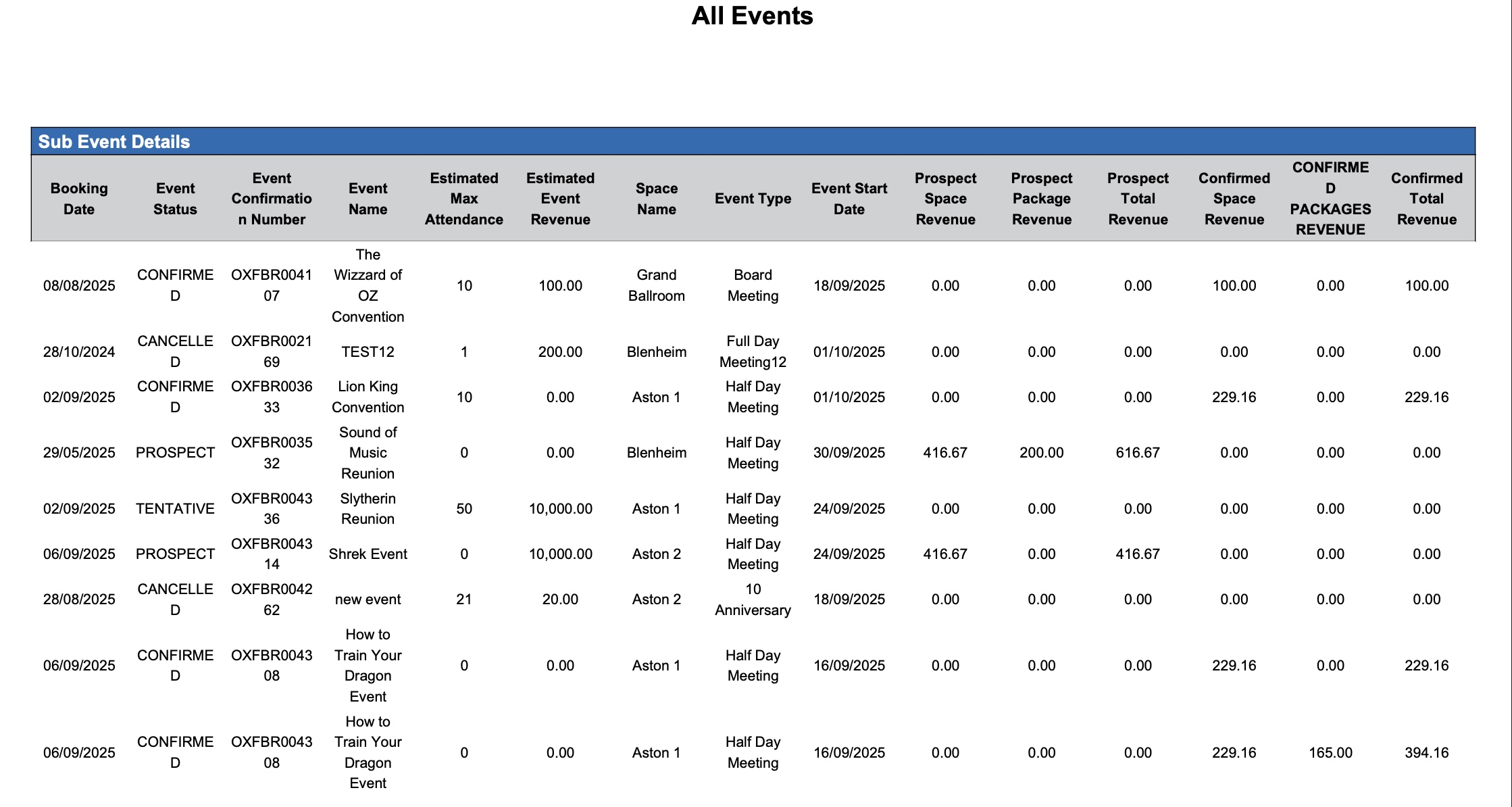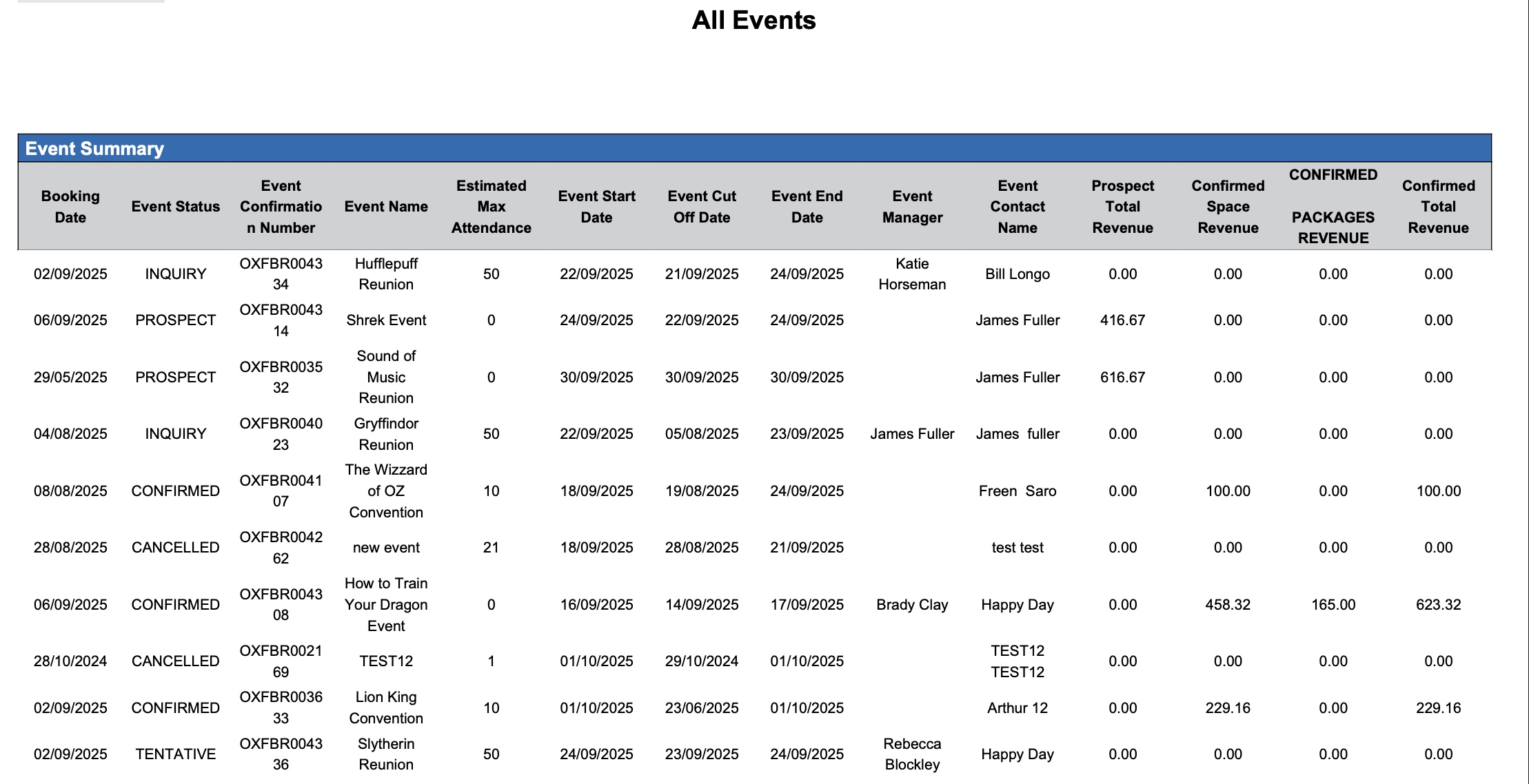 The report is designed to give users full visibility into the property's event pipeline and historical data, supporting operational planning, forecasting, and performance analysis. It includes essential event details such as: