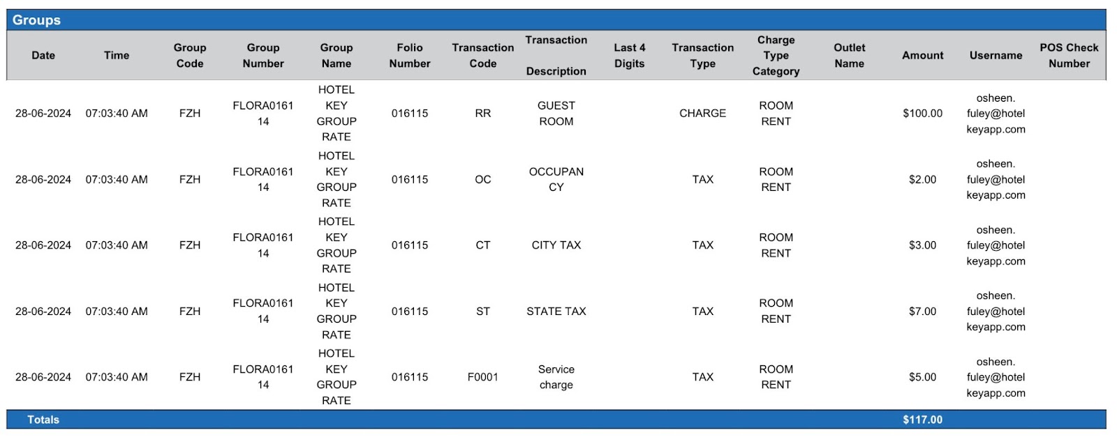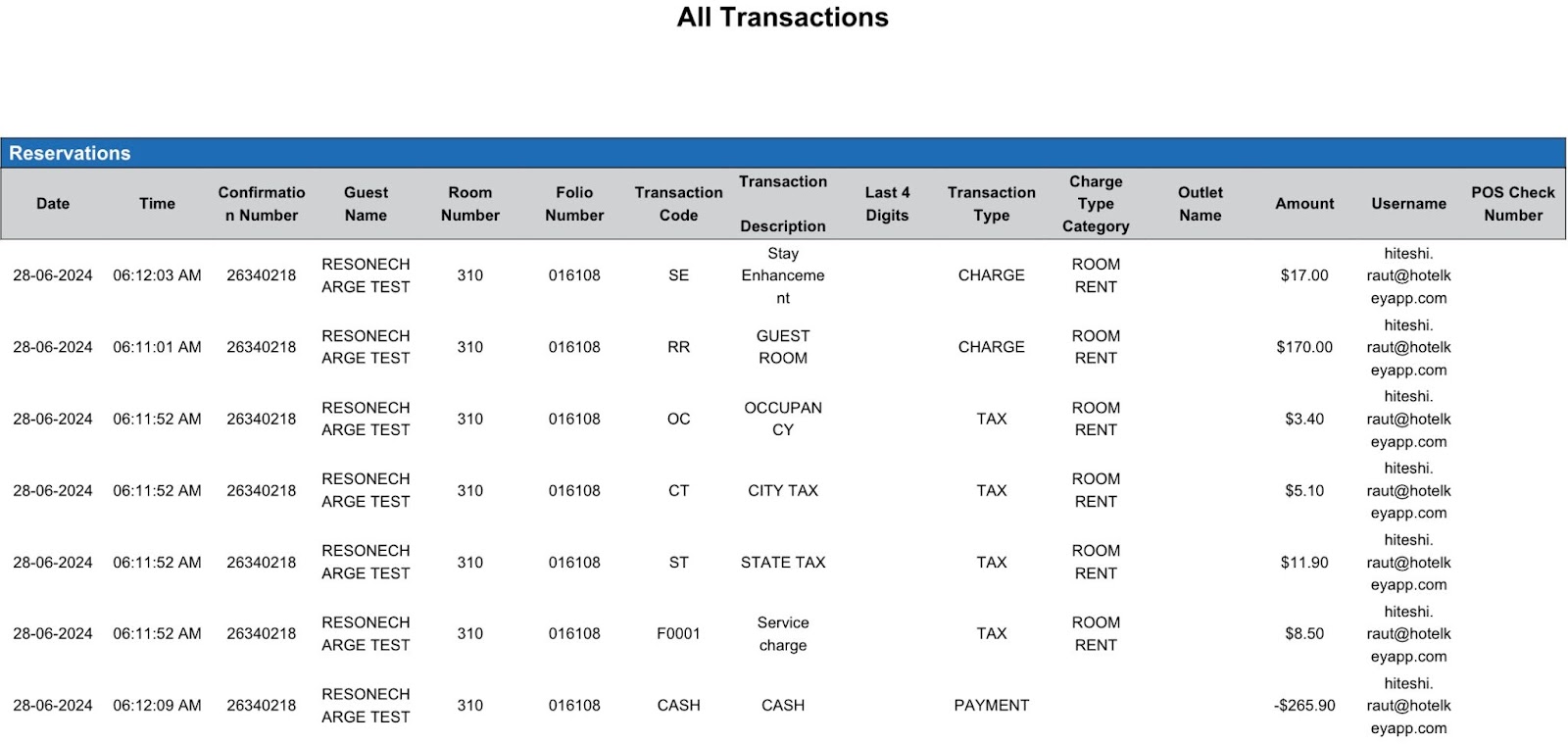 Report Description: All Transactions Report provides a list of all transactions including transaction code, transaction description, transaction type and room number individually and the corresponding amount for a defined date. This report includes transaction data for Reservations, Groups and House Accounts