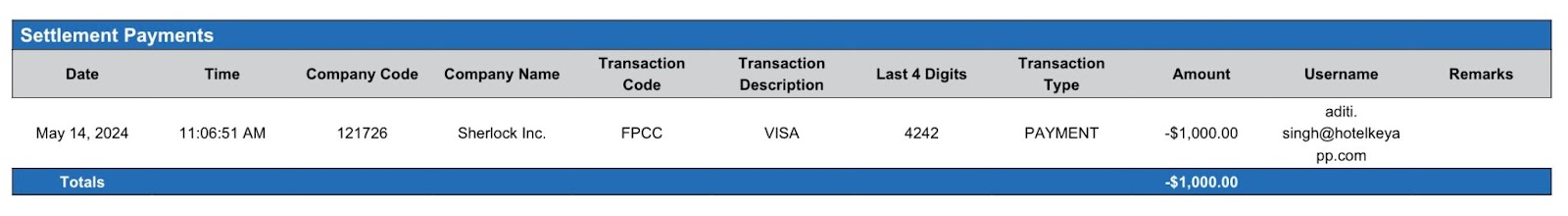 Settlement Payments: The Settlement Payments section provides a detailed list of all transactions by a user associated with a company in accounts receivable.