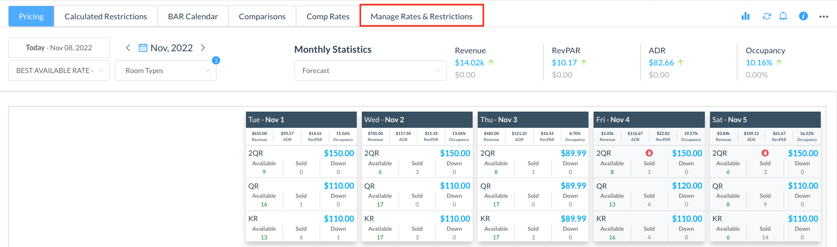 The rate calendar page loads. Select Manage Rates & Restrictions | ![]() Manage Rates & Restrictions |