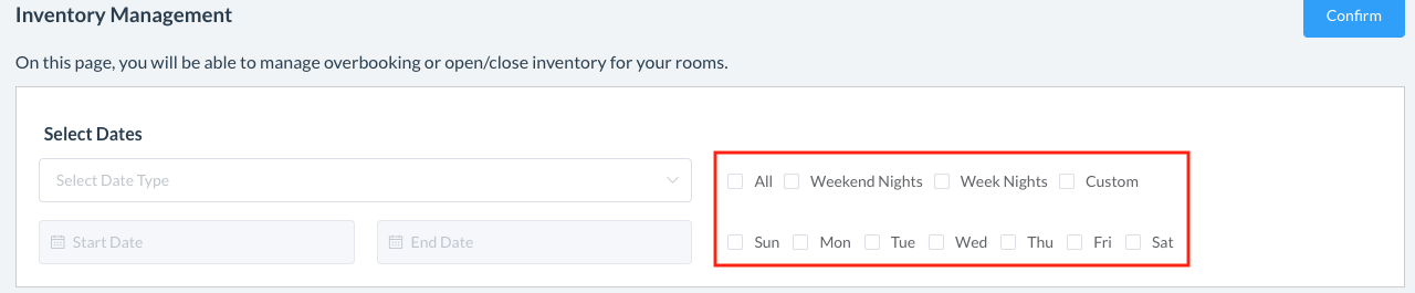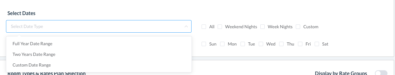 On this page, you will be able to manage overbooking for your rooms. Select Date Type for a Full Year, Two Years or choose a Custom Date Range | ![]() ![]() |