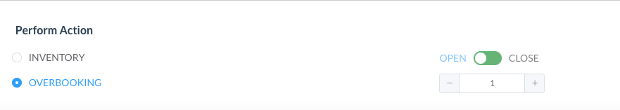 Perform Action - Allow Overbooking For the selected room types and rate plans, choose to Apply overbooking by a determined number by adding or subtracting on the counter ( - / + ) Complete the action by selecting the Confirm button at the top right of the screen | ![]() Allow overbooking by set number |