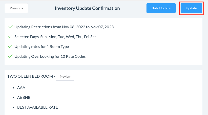 Select Room Types & Rate Plans you want to allow overbooking for. Note: when selecting the box for the room type, by default all rate plans associated will be selected as well. You can manually select the rate plans if you wish to include only specific ones | ![]() |