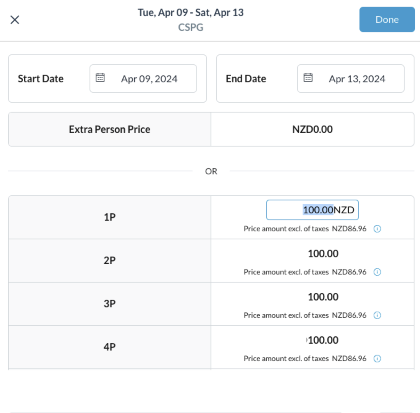 Alternativ können Sie die Personenpreise aktualisieren, indem Sie einen statischen Tarif in das Feld 1P eingeben, und alle anderen Preise ändern sich automatisch. Sie können jedes Feld auch manuell ändern. Wählen Sie Fertig aus, und überprüfen Sie die Änderungen Hinweis: Die vorgenommenen Änderungen wirken sich auf das ausgewählte Datum aus. Sie müssen die gleichen Schritte für jeden Tag ausführen, an dem Sie die Preise aktualisieren möchten. | ![]() |