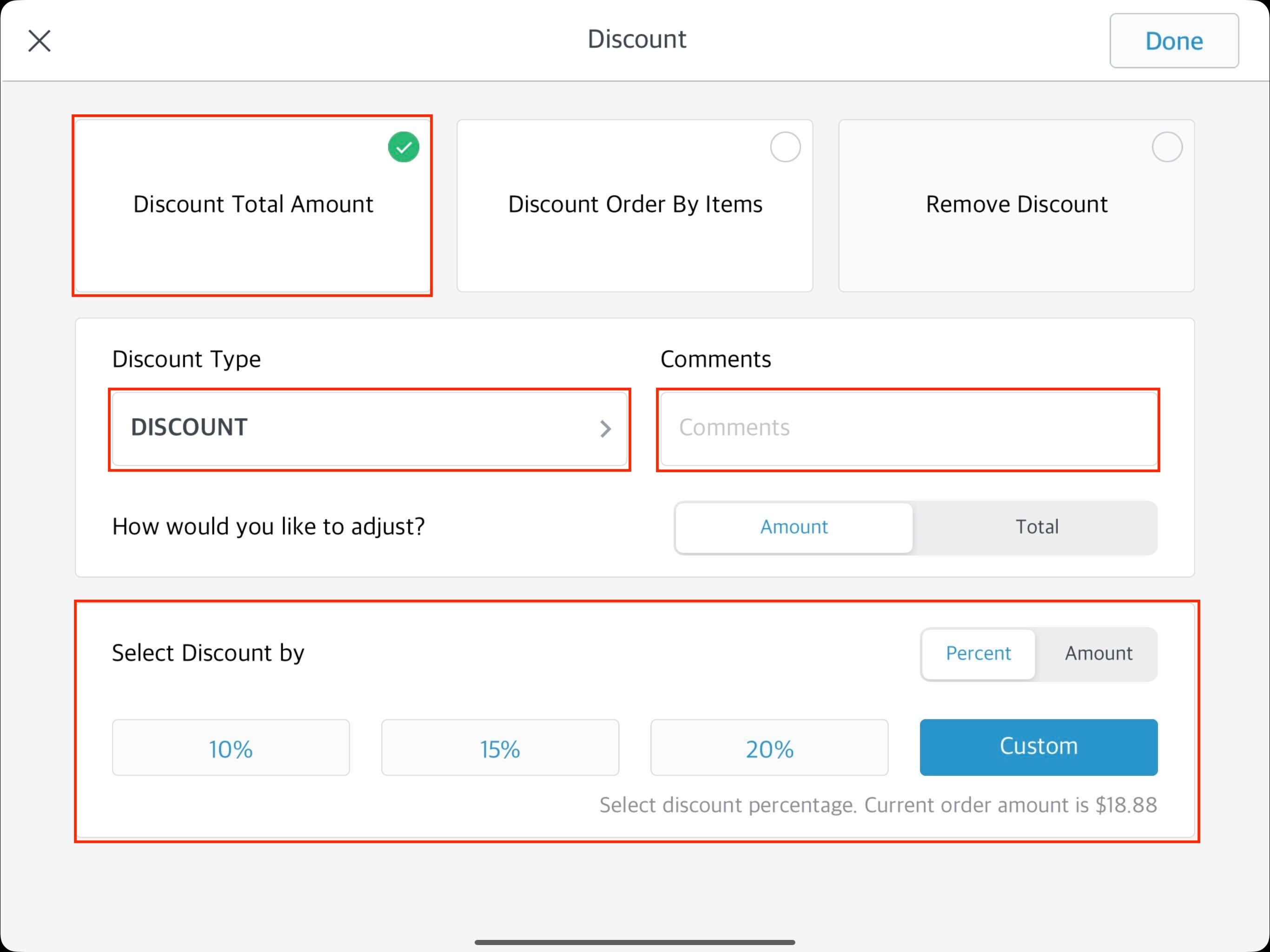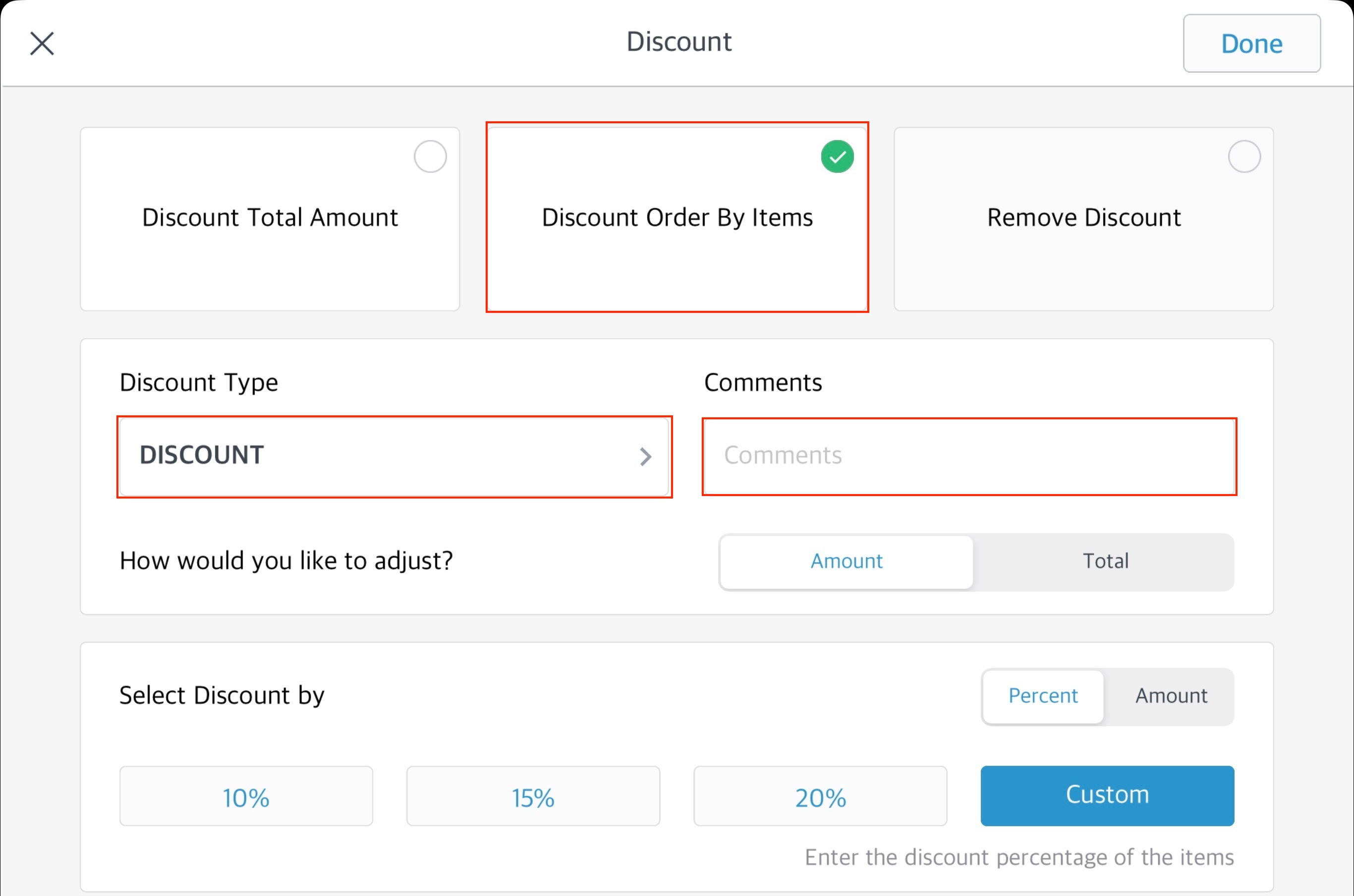 You can discount by one of the following two options: How would you like to adjust? If you select amount (default) - proceed to the Select Discount by section, select/enter a Percent or select the Amount link to enter a dollar amount, and select the items that the discount will apply to. If you select total - enter the new order total including or excluding tax
