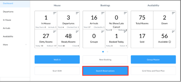 On Frontdesk from HK-Home Select Search Reservations on the Dashboard page. | ![]() |