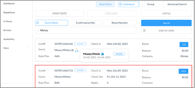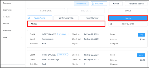 The Search Reservations page loads. Search for the reservation by guest name or confirmation number. | ![]() |
