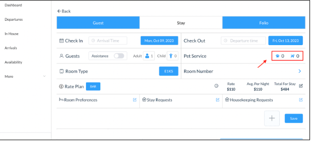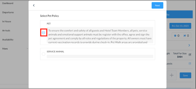 Select the applicable type of Pet Policy associated for reservation. In this example, we choose the Pet option that has a fee. | ![]() |