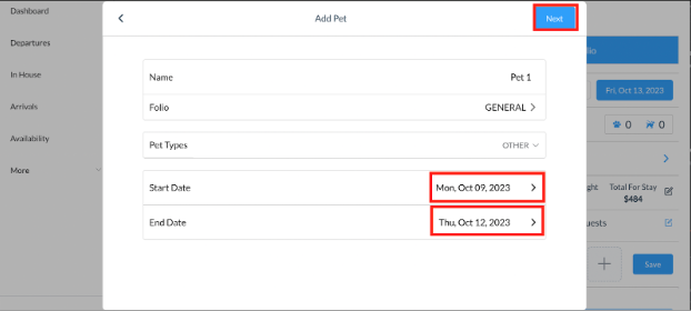 The pet page loads. Select the date ranges for the charges to be placed and select Next. Note - Charges are placed per day in the folio therefore if the pet fee is a one time fee, select the same start and end date. | ![]() |