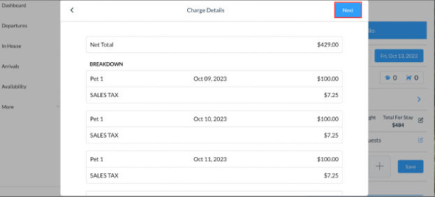 Charge details of the pet fee are shown in the next screen. Select the Next button. | ![]() |