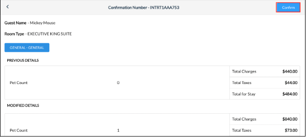 The confirmation page will appear. Once you confirm details are correct, select Confirm. Once you select confirm, all charges will be placed on the folio. | ![]() |