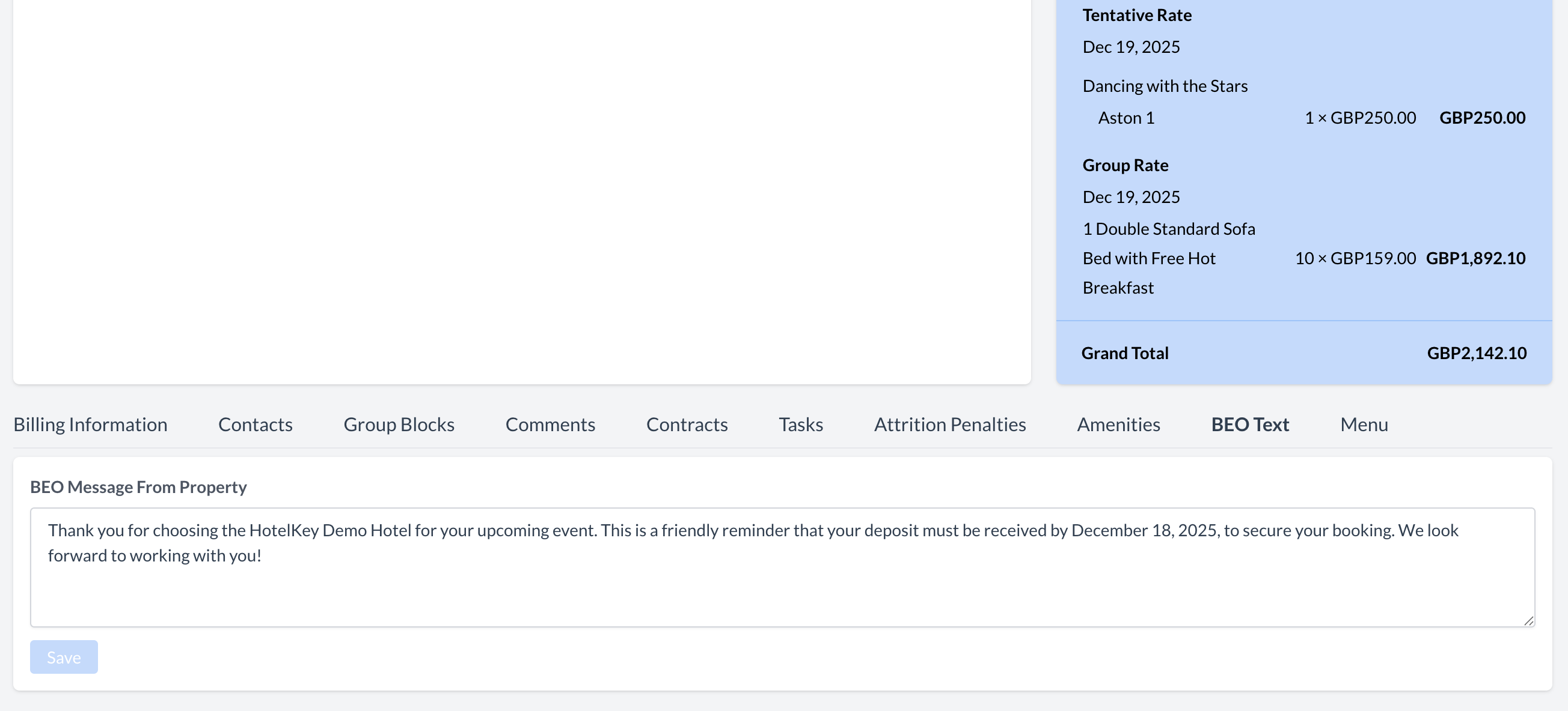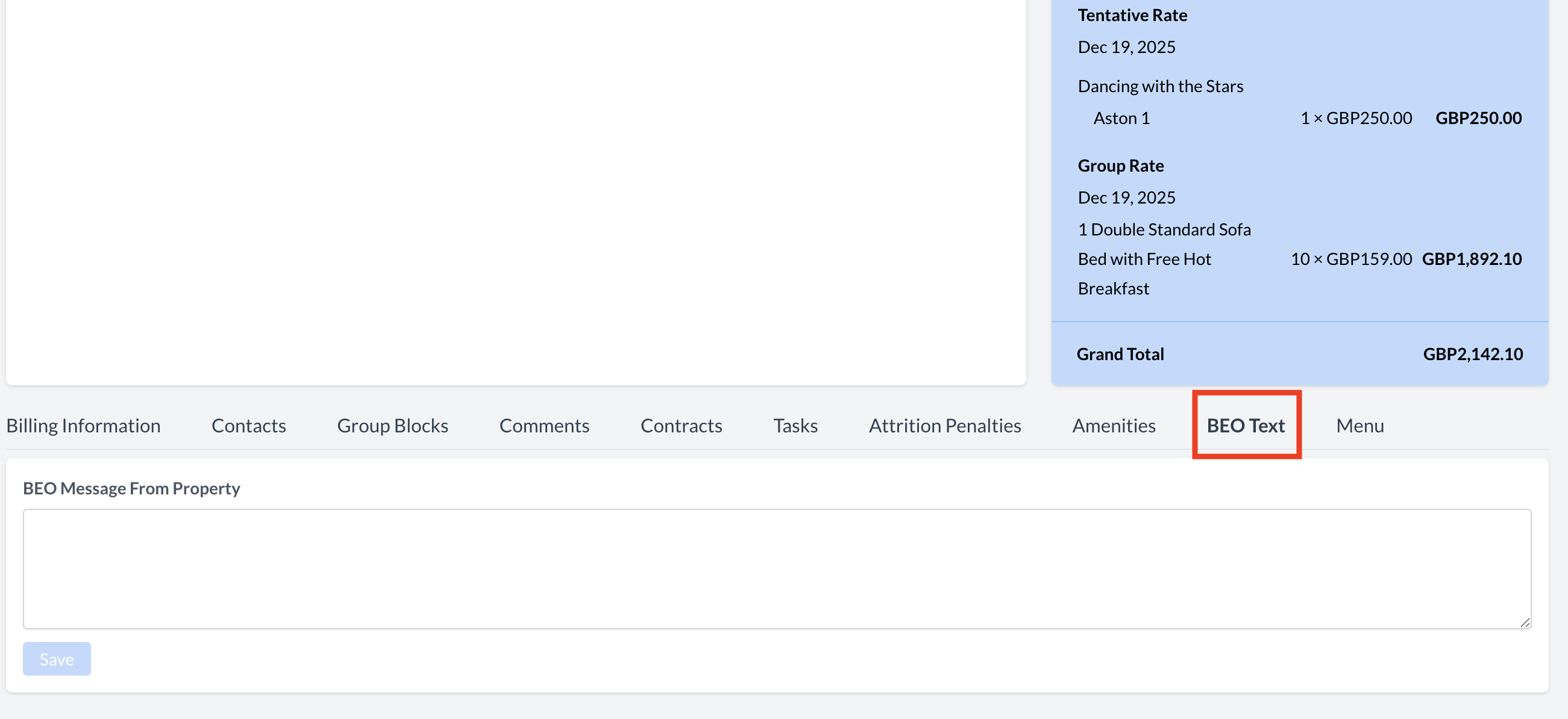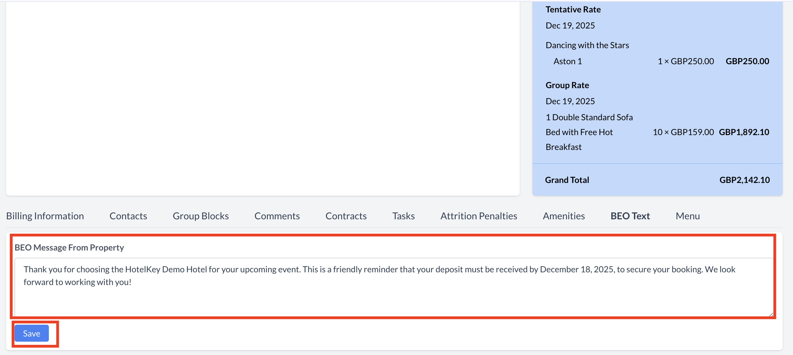 This is the message your client will see when reviewing the BEO. | ![]() BEO Text - Custom Message from Property |