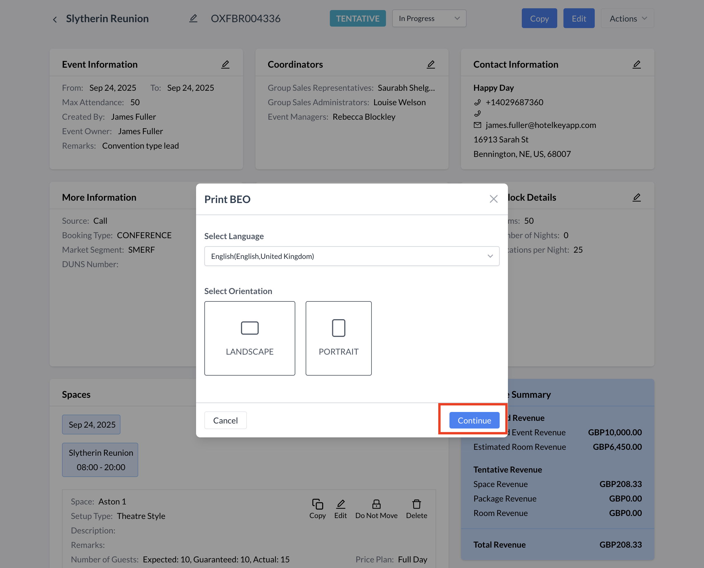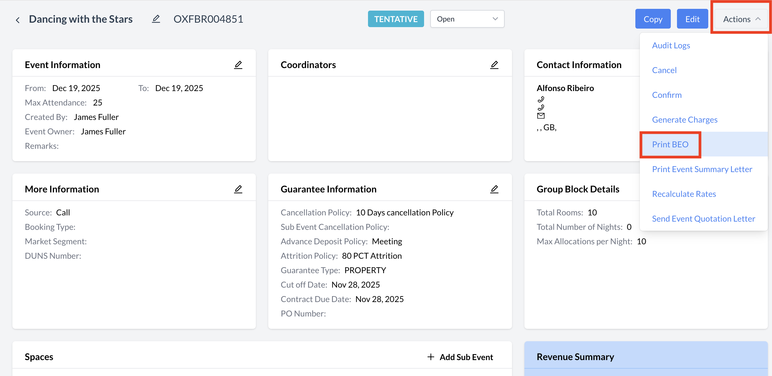 | ![]() Actions Menu - Print BEO |