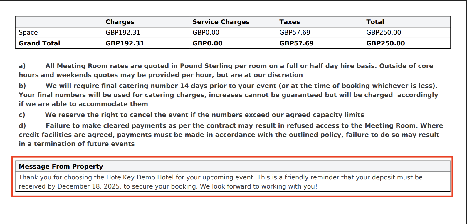 The updated message will now appear on the BEO under the Message from Property section. | ![]() BEO Text Section - BEO Message |
