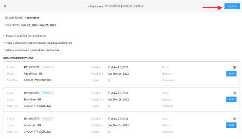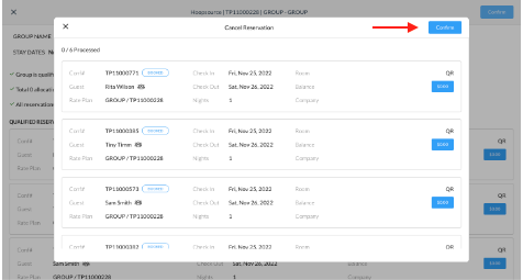 The Group Cancellation screen loads where the following items are noted - group name, stay dates, if the group is qualified for cancellation and how many allocated rooms will be returned to general inventory. Click on Confirm If there are reservations attached, the cancel reservation screen will be displayed. Click on Confirm to approve the cancellation of the member reservations as well | ![]() ![]() |