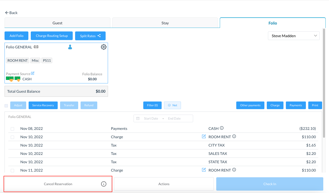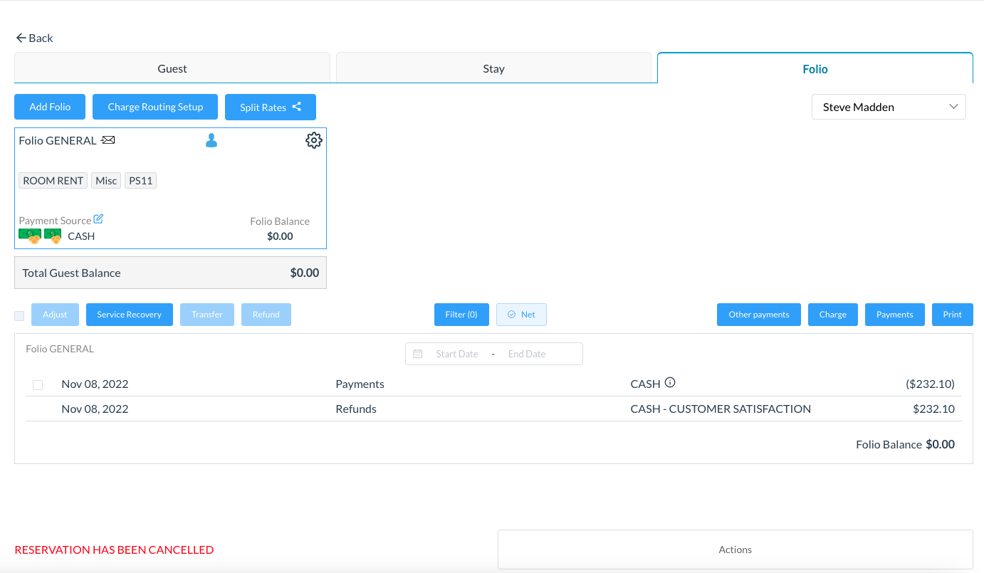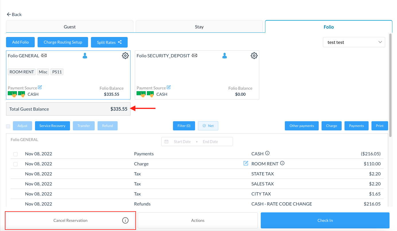 The refund is processed. Note that there is no longer a credit balance on the reservation. | ![]() |